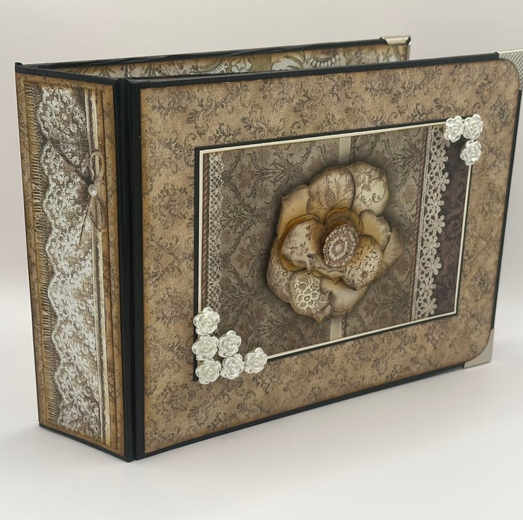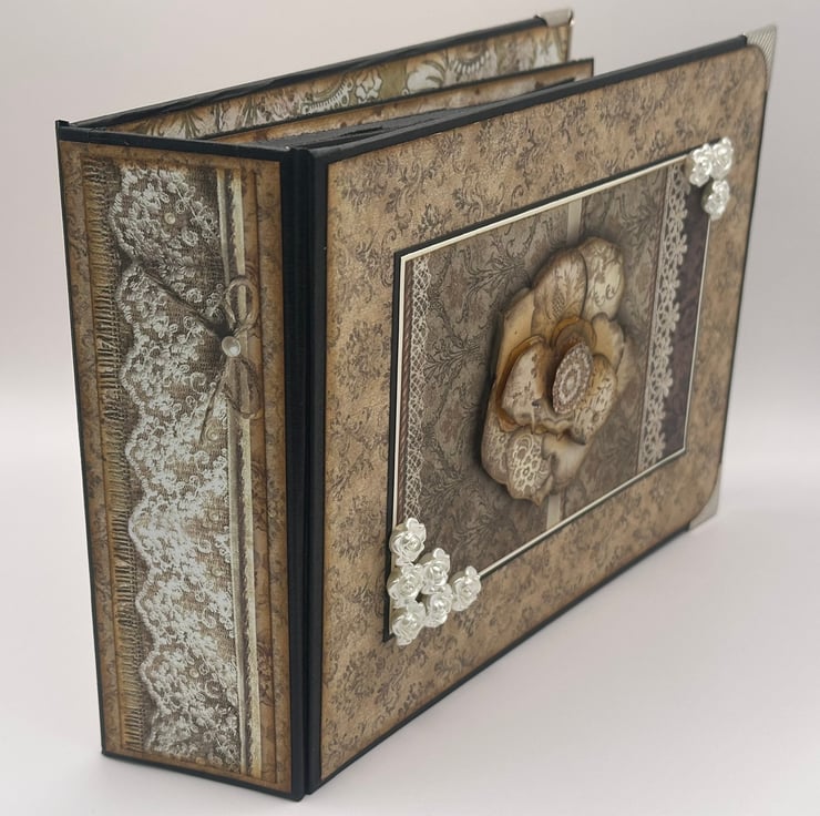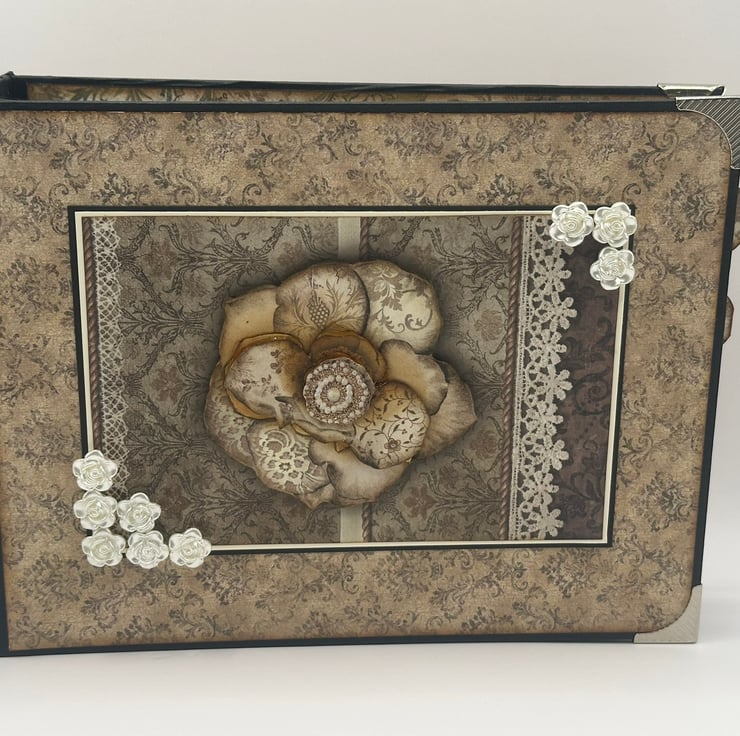 This beautiful album measures 8 by 6 inches with a 2 inch spine. It has silver art deco style corner protectors and flowers.