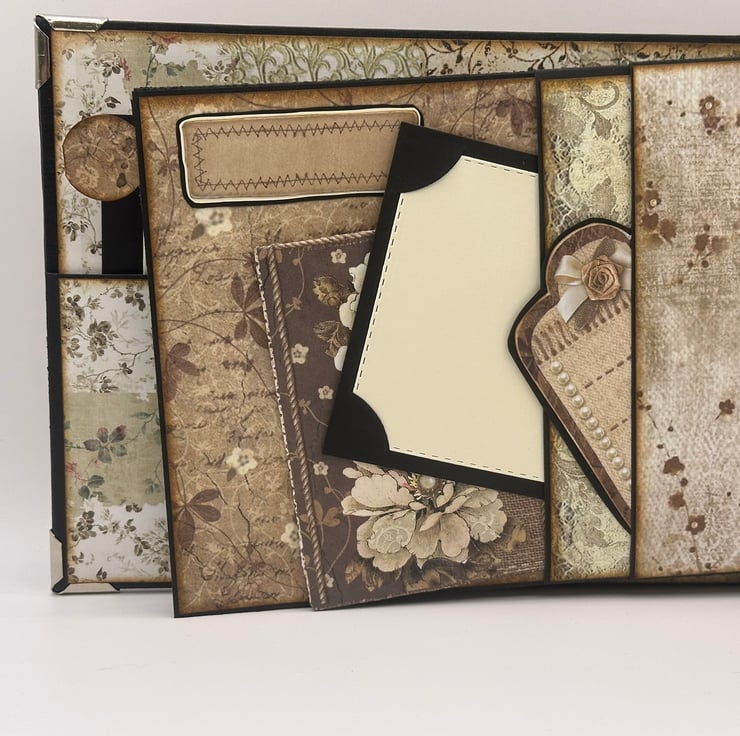 The album contains four beautiful tunnel pages that are decorated with design paper to match. Inside the tunnels you will find a tag that you can place a photo or journal your memories.