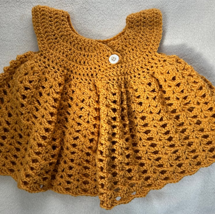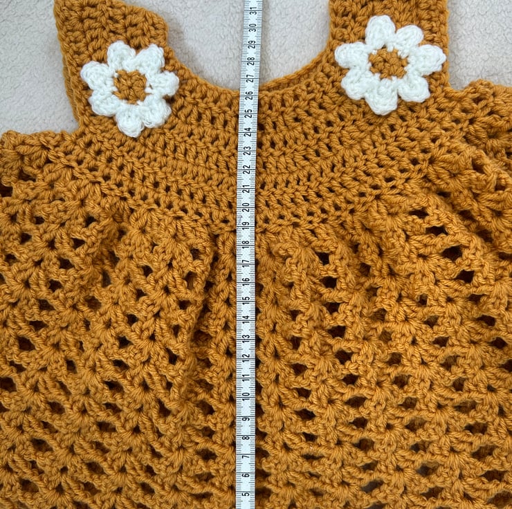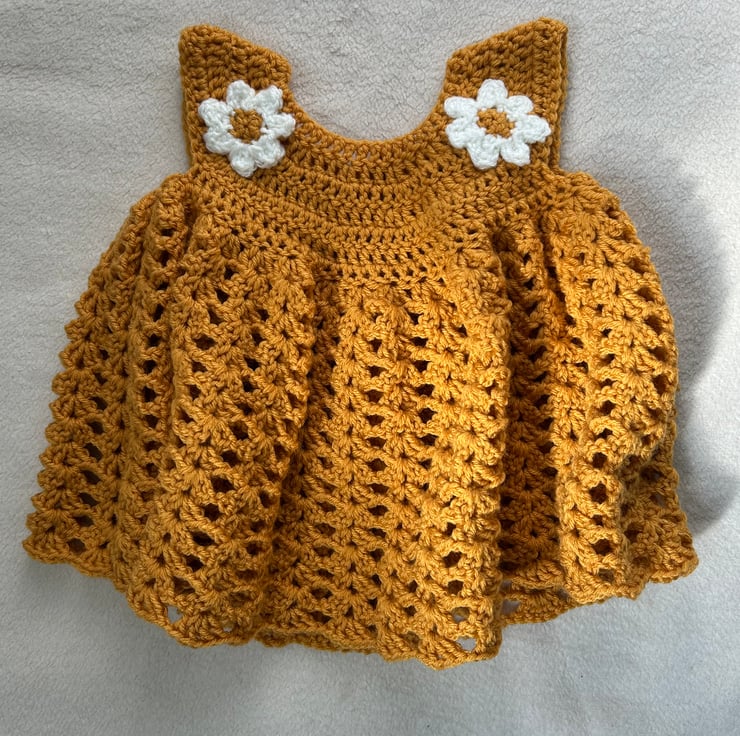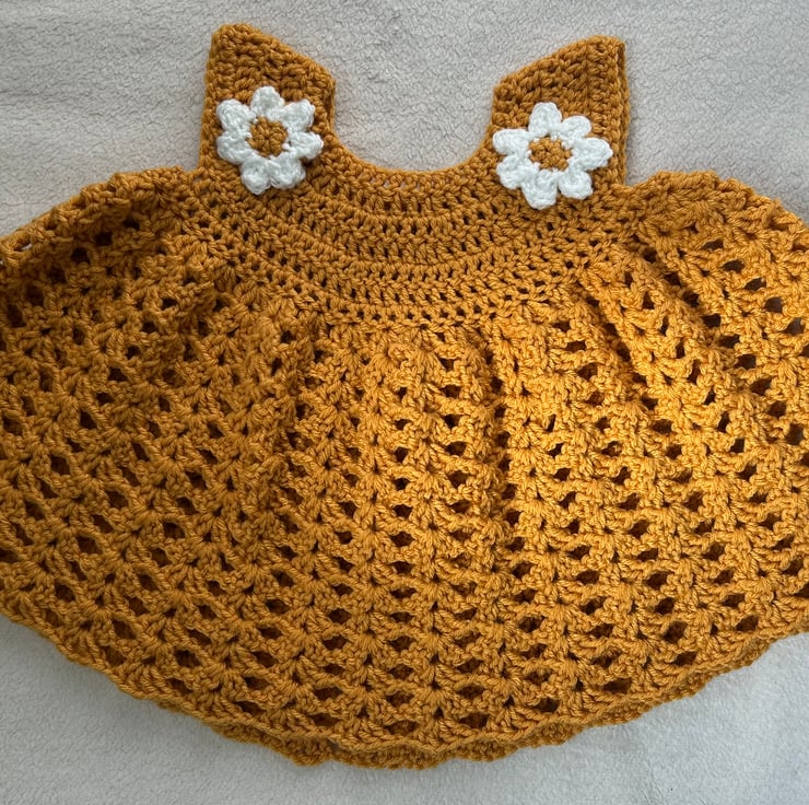 Beautifully soft dress with rounded yoke and full skirt. A daisy on each shoulder and a single button to fasten at the back. Hand crocheted in 100% acrylic yarn. Can be machine washed at 40 degrees and tumble dried. Would be perfect paired with white tights or leggings. Made to size 6m-1 year, measurements shown in photos. Vegan. Thanks for the pattern by frisianknitting