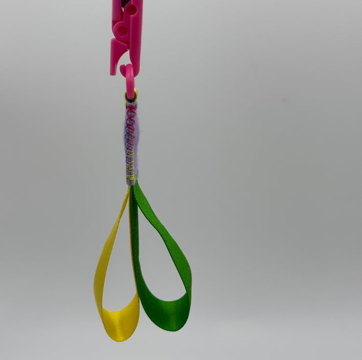 I was originally commissioned to attempt making a fidget toy out of ribbon, and the result turned out to be so successful that I ended up offering it as an option for everyone. This latest iteration, using the same kind of clip that I usually use on pacifier clips, or is used for braces/suspenders, is intended for people who may not have keys or a belt loop to clip the lobster clip type on.