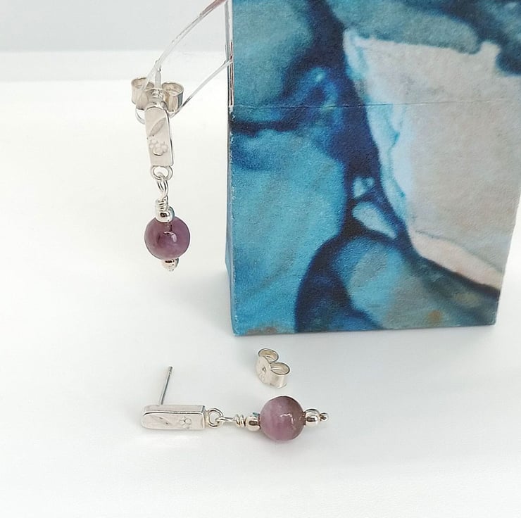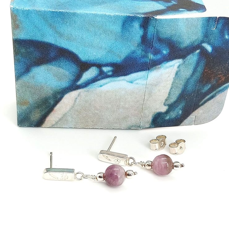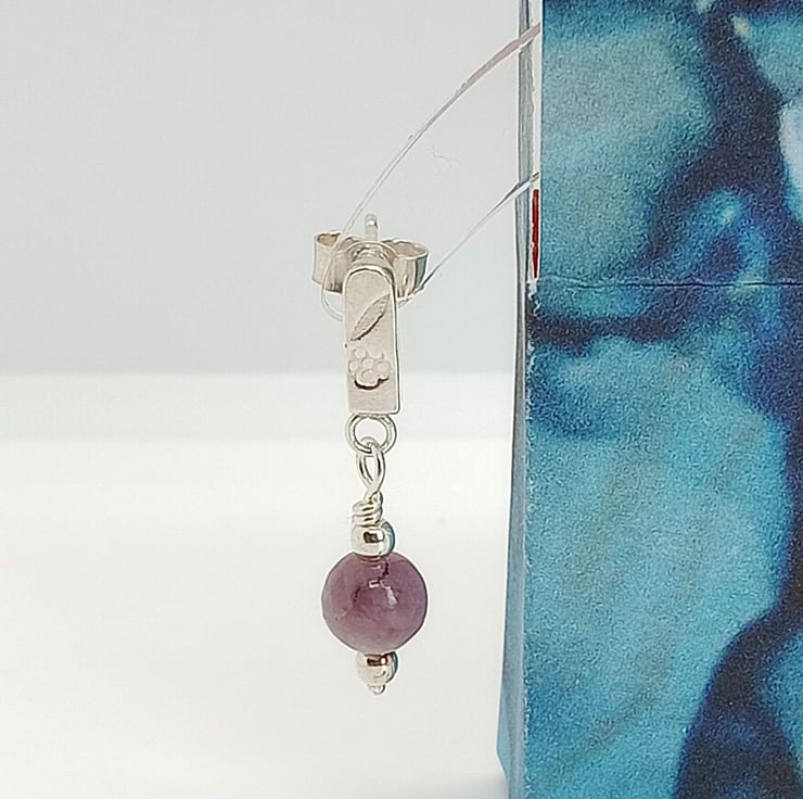 Handmade flower and leaf stamped bar stud earrings sterling silver, suspended from the earrings is a 6 mm round lepidolite gemstone bead.