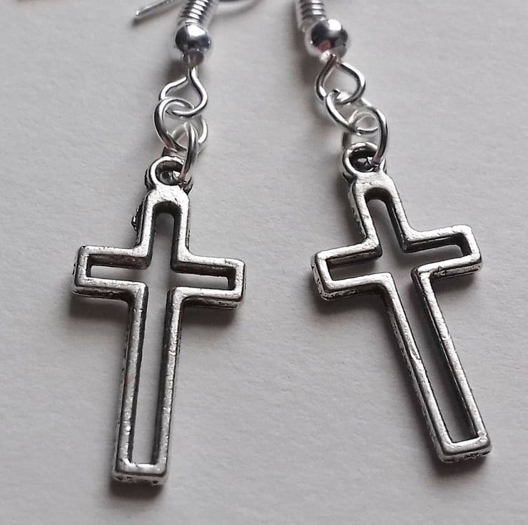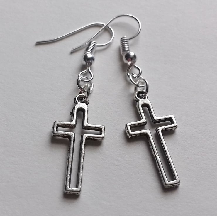 These sweet earrings feature shiny cross charms hanging on silver plate hooks