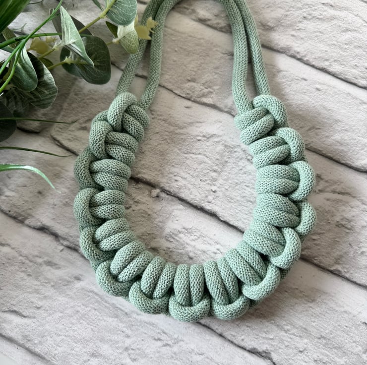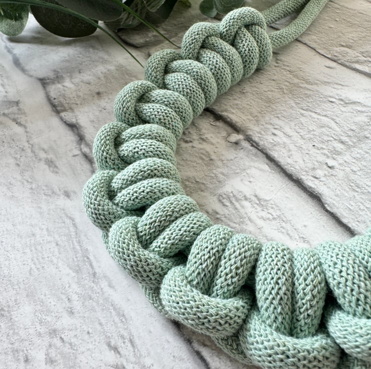 The design features a tactile, bold woven texture and a lightweight feel that sits comfortably around or just below the collarbone.