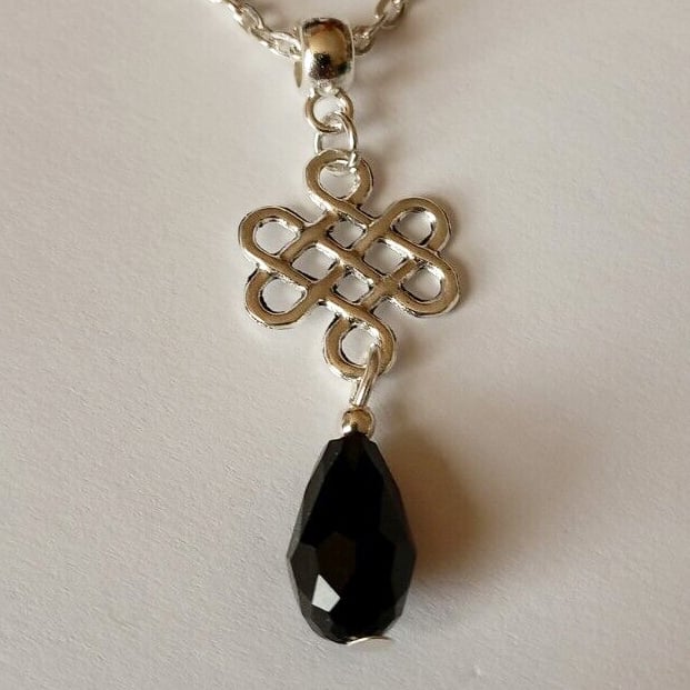 This nice necklace has a black crystal and Celtic design hanging on 18" silver plate chain.