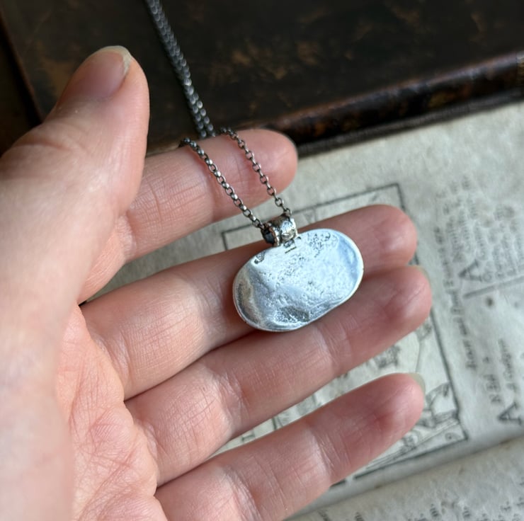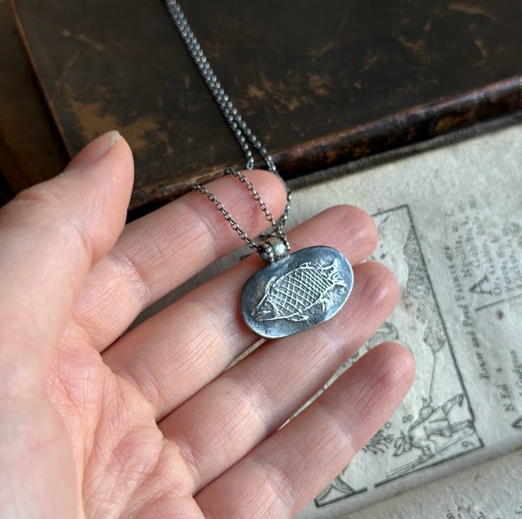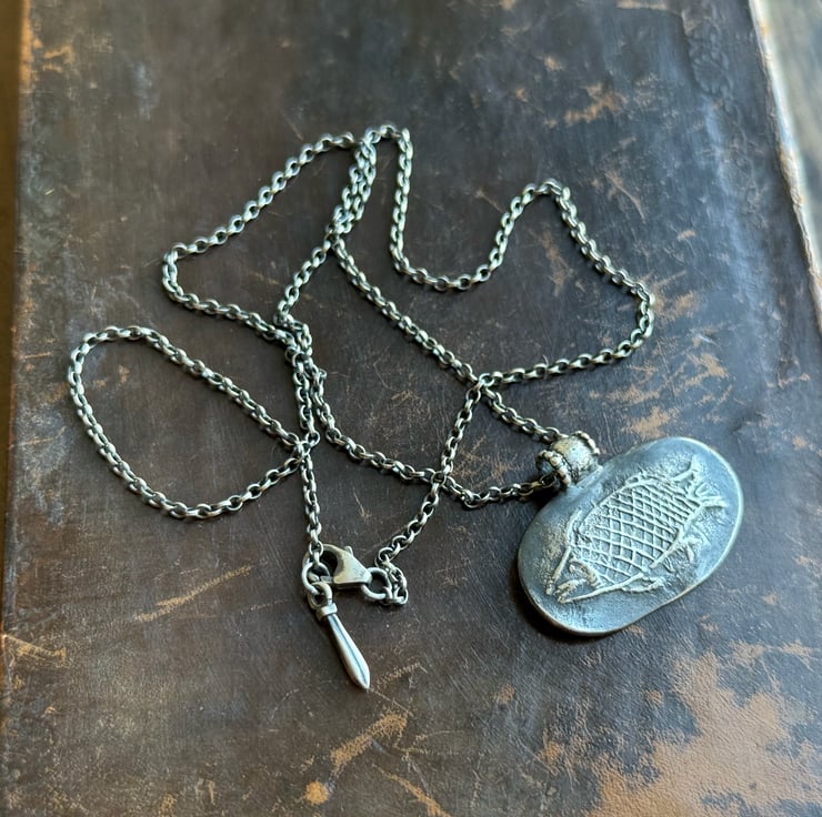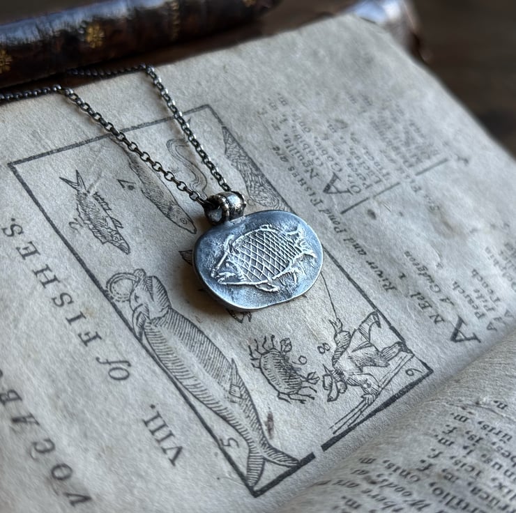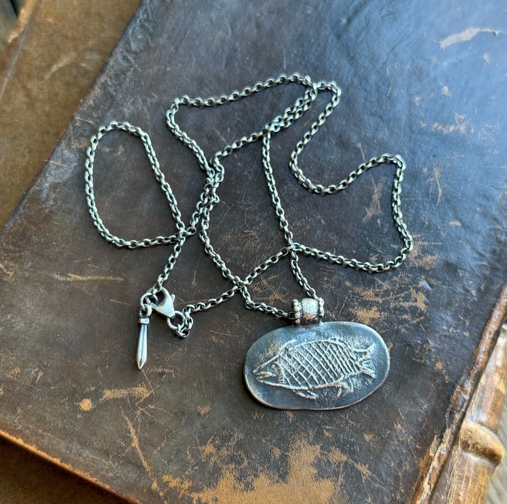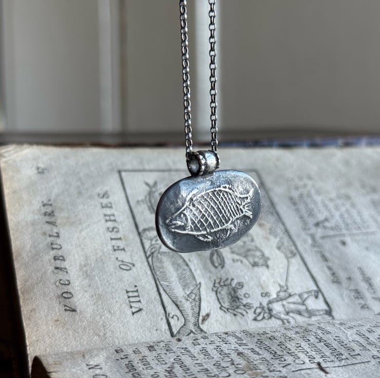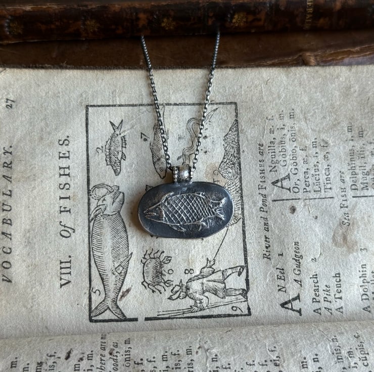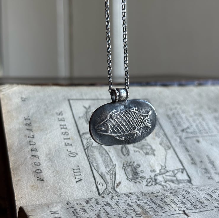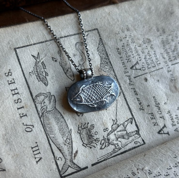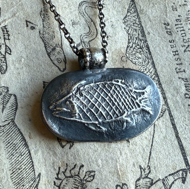 A unique clay pipe fish impression necklace, the impression of the fish was taken from an original design on a clay pipe bowl we found during one of our mudlarking adventures. The little fishy has been oxidised and rubbed back to give an antique look.