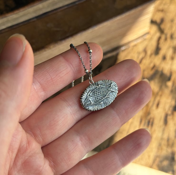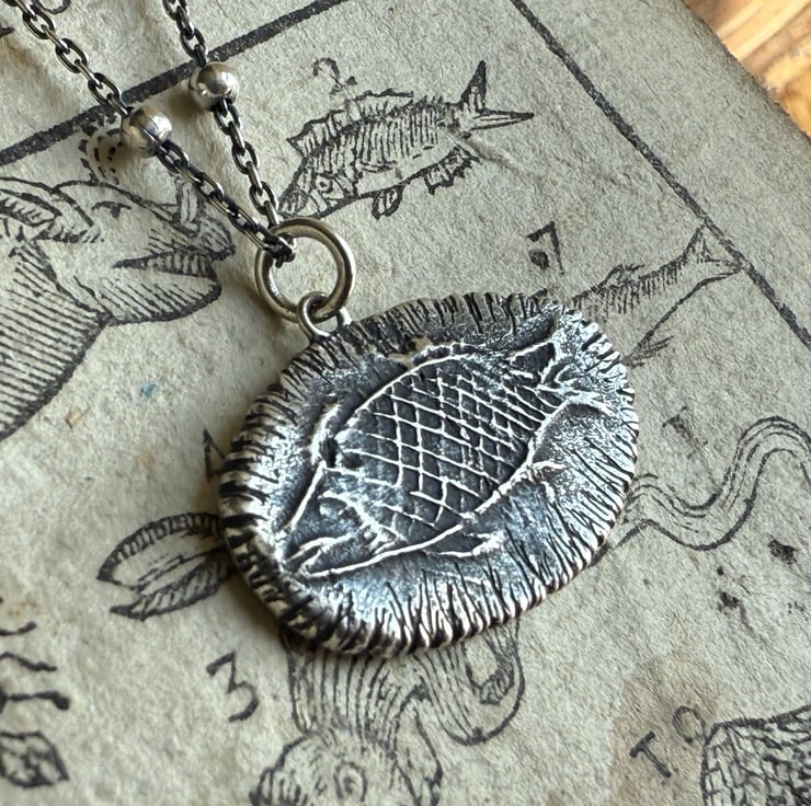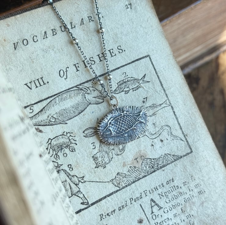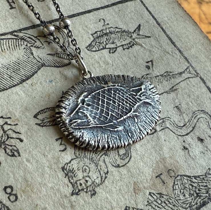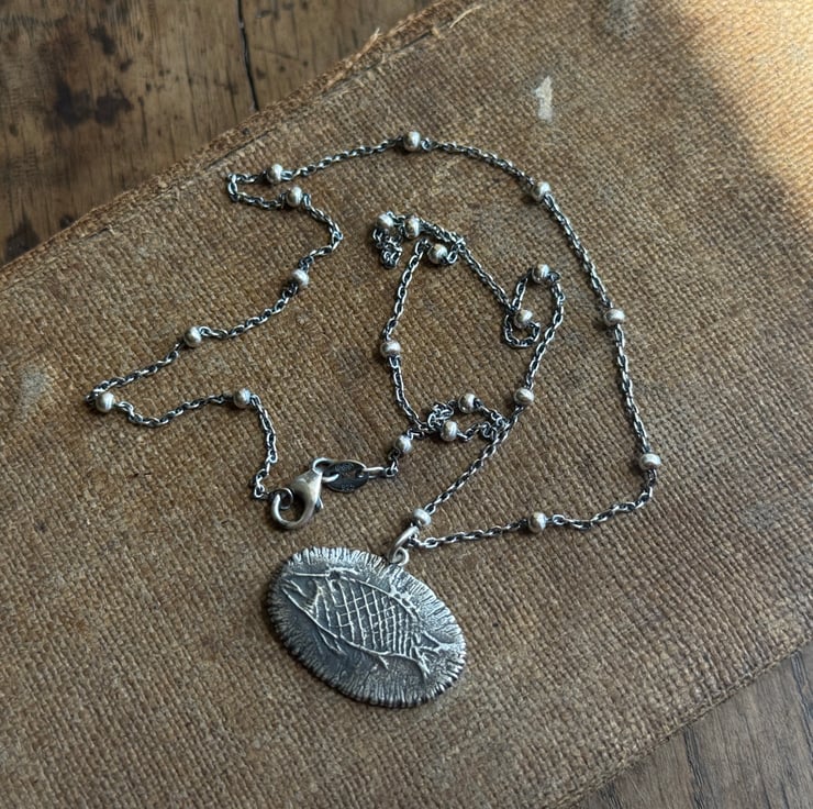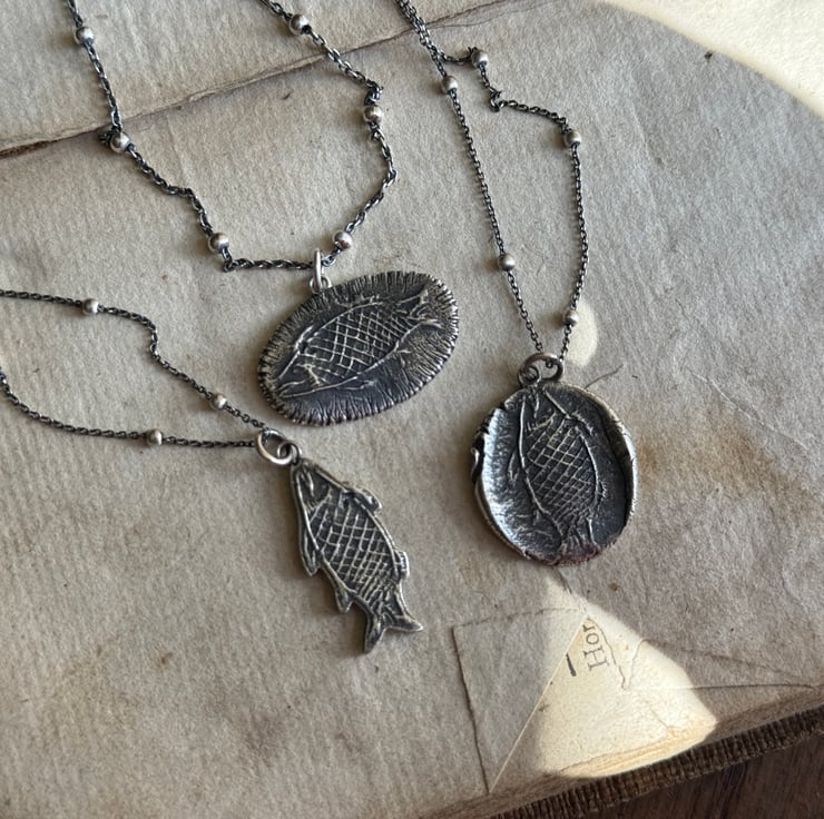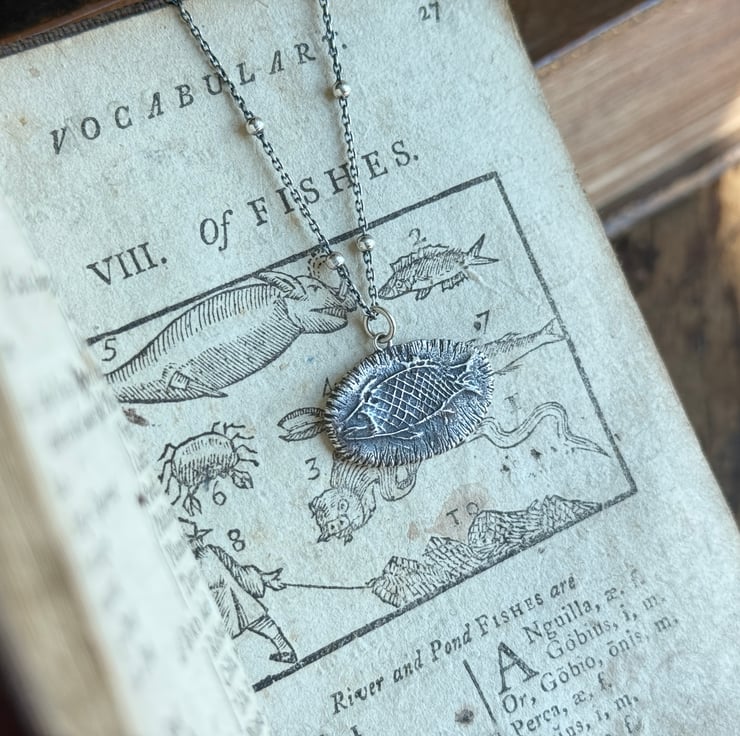 A unique clay pipe fish impression necklace, the impression of the fish was taken from an original design on a clay pipe bowl we found during one of our mudlarking adventures. The little fishy has been oxidised and rubbed back to give an antique look.