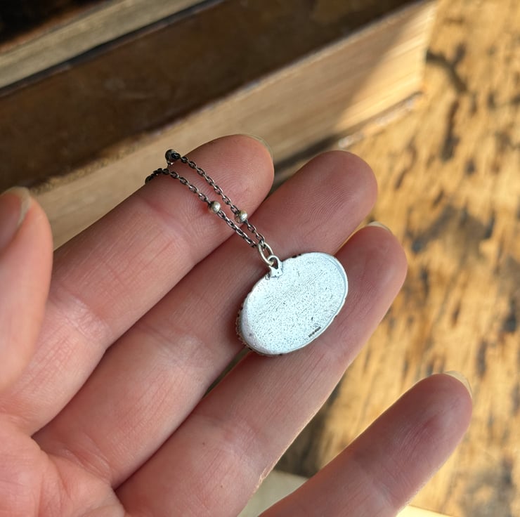 It hangs from a pretty sterling silver beaded chain, 18' in length (approximately). Please refer to photos for size comparison of pendant.