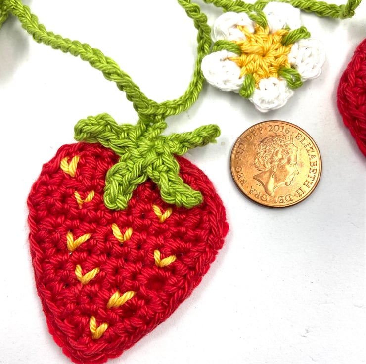 Five tempting strawberries, six pretty flowers and bright green leaves make up this summer garland. Everything is crocheted in cotton ( the strawberries from a pattern by the Caffeinated Snail) and the strawberries are backed with stiffened craft felt . The whole garland measures approximately 140 cm and the ends of the ‘ string’ are finished with painted wooden beads for easy tying.