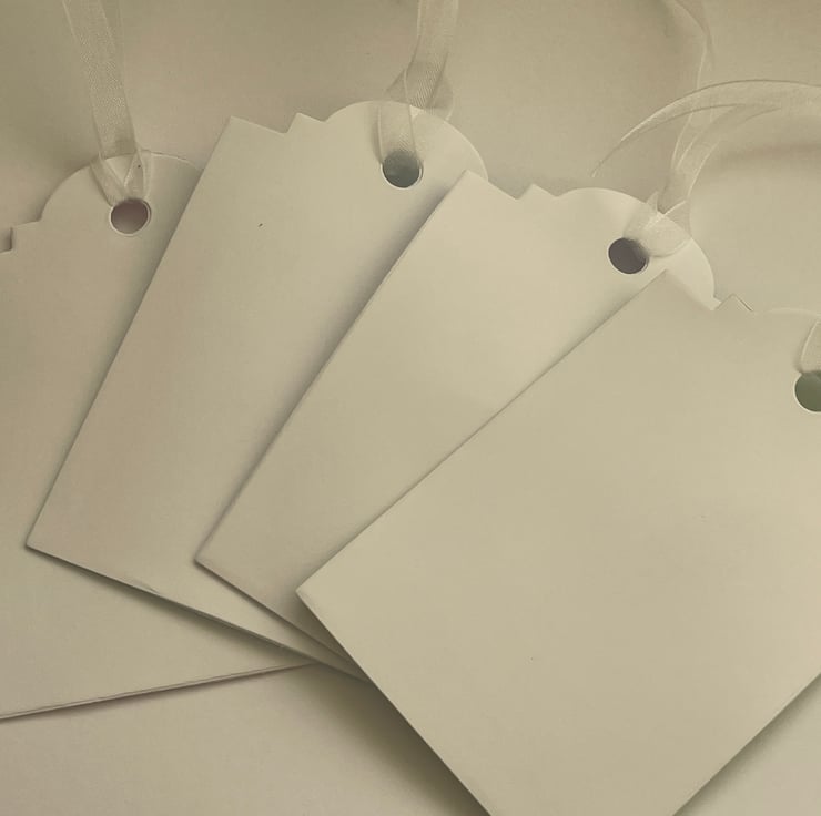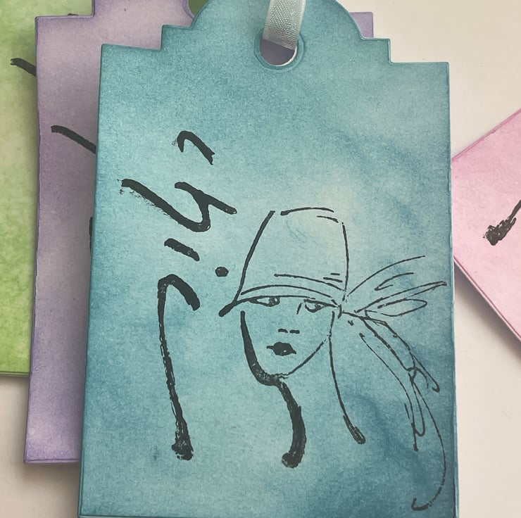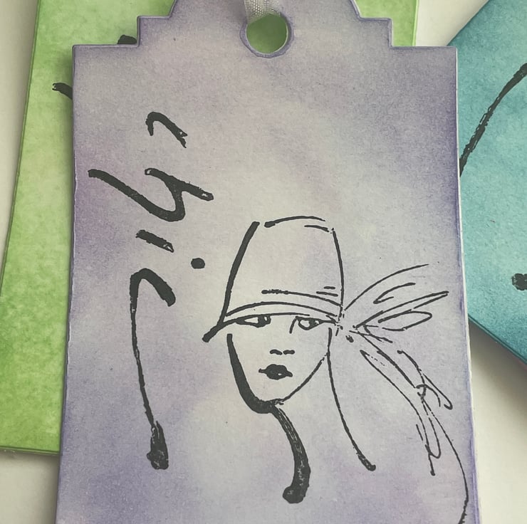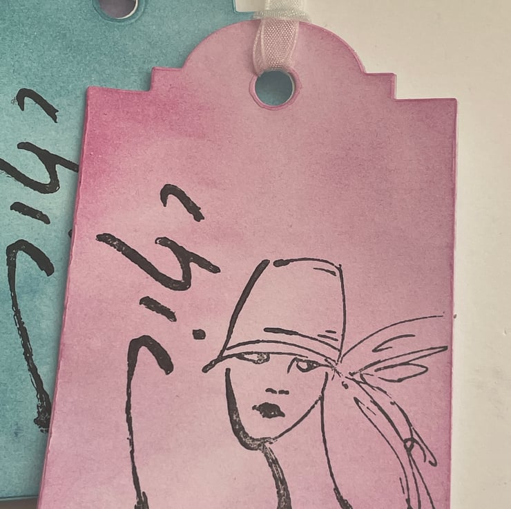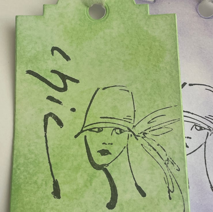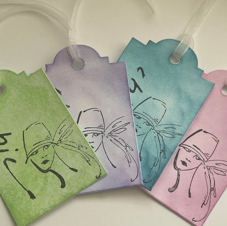 Feminine and pretty. This set of 4 gift tags are inked in 4 different pastel colours - green, purple, pink and teal. Each one has the work Chic stamped in black down the side and the image of a woman stamped in the middle. The image is sketchy and she is wearing a cloche hat, rather 20's in style. Each one has a white organza ribbon tie. Very elegant and feminine.