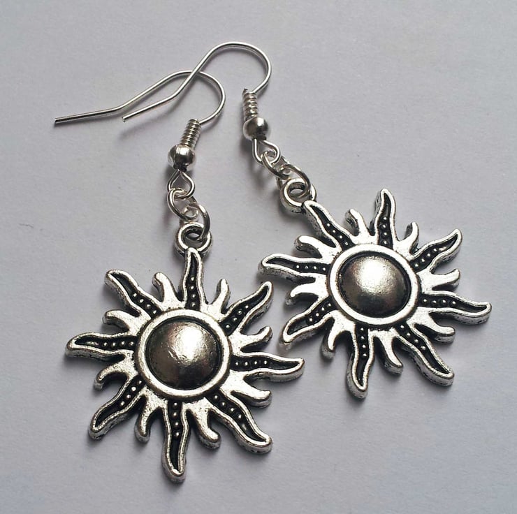 This wonderful pair of earrings features beautifully detailed sun charms hanging on silver plate hooks.