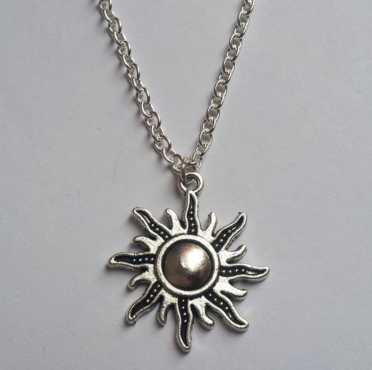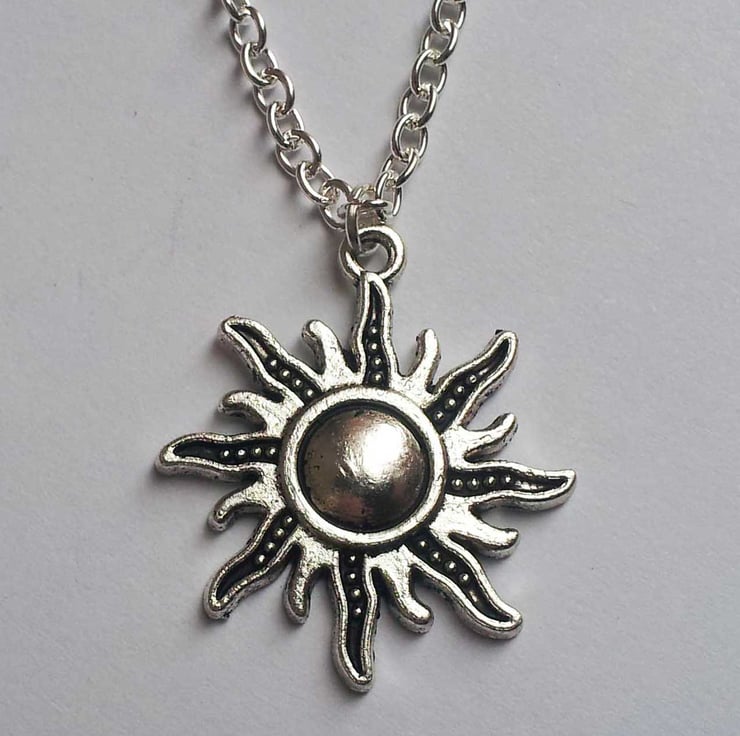 This wonderful necklace features a beautifully detailed sun charm hanging on 18" silver plate chain.