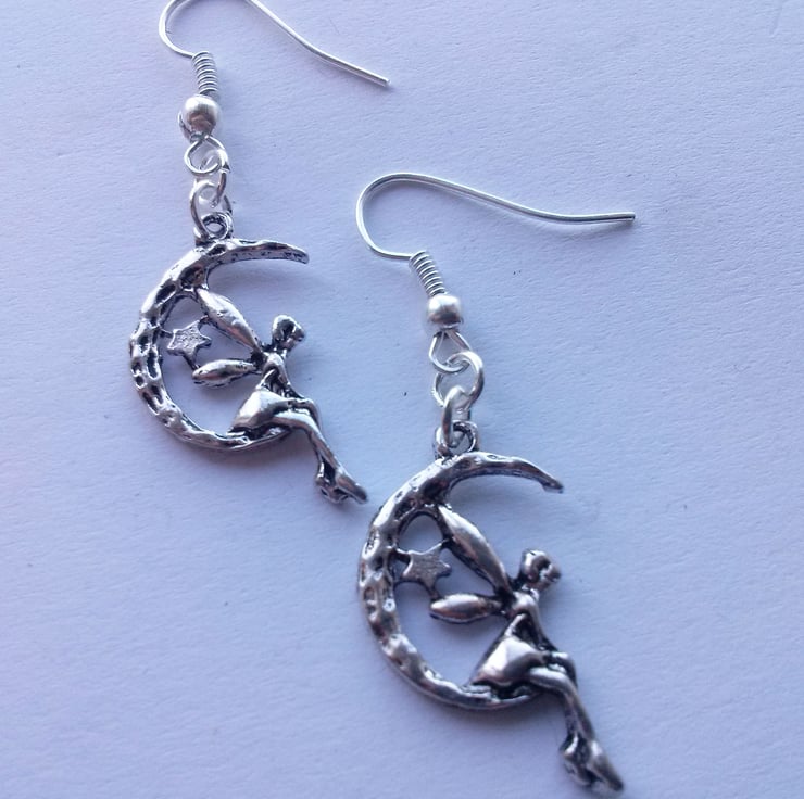 These beautiful earrings have elegantly detailed moon fairy charms hanging from silver plate hooks.