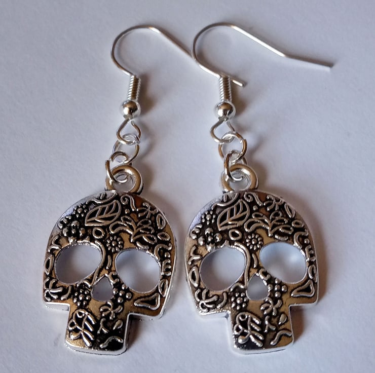These gorgeous earrings feature nice sugar skull charms hanging from silver plate hooks.