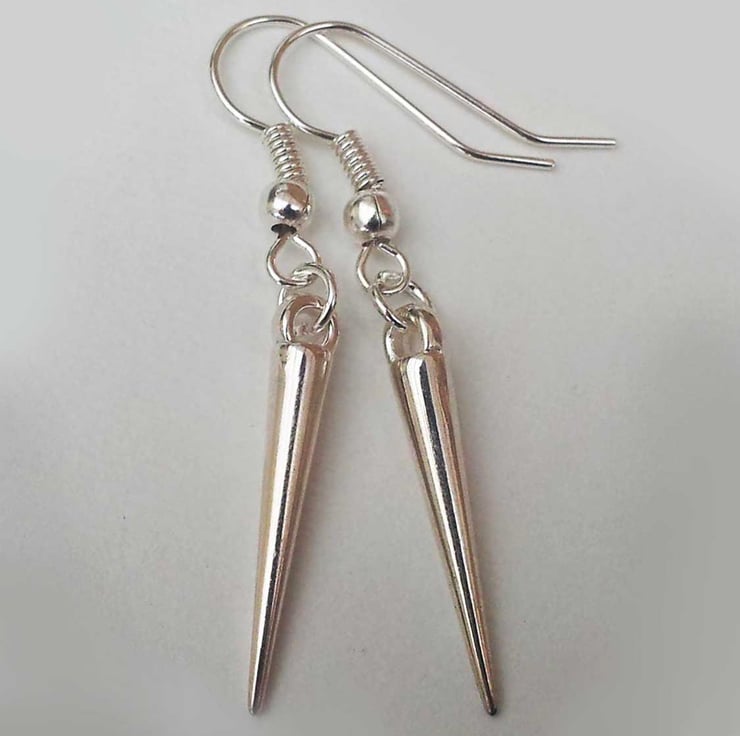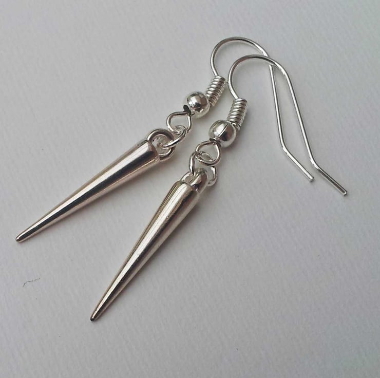 These wonderful earrings feature short shiny silver spikes hanging from silver plate hooks.