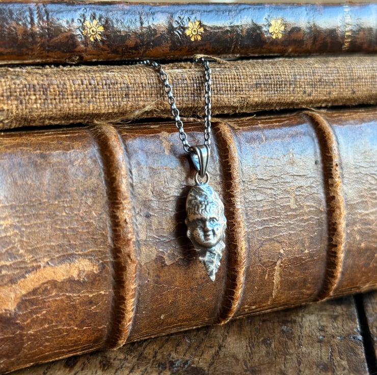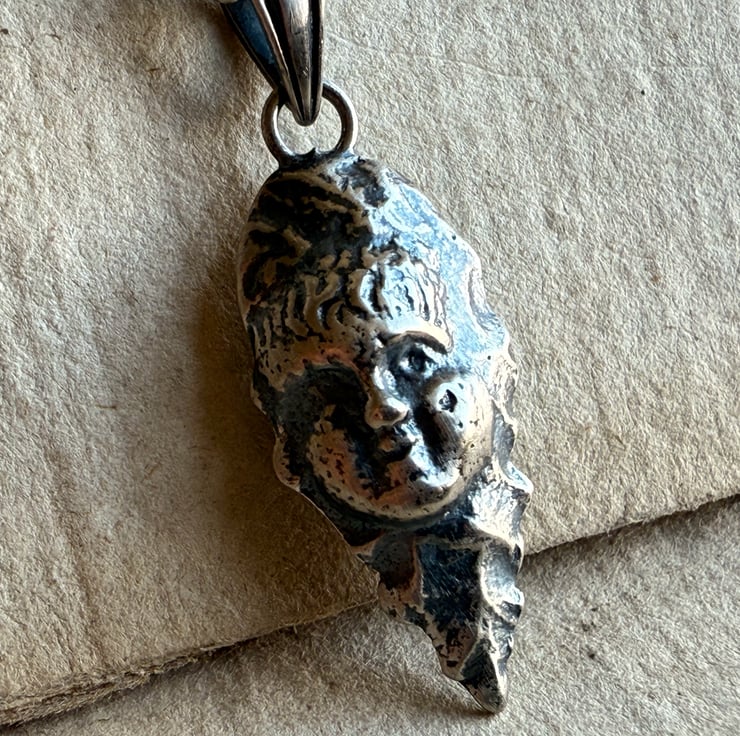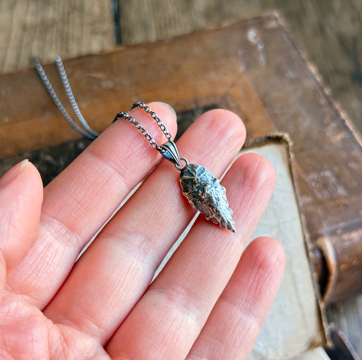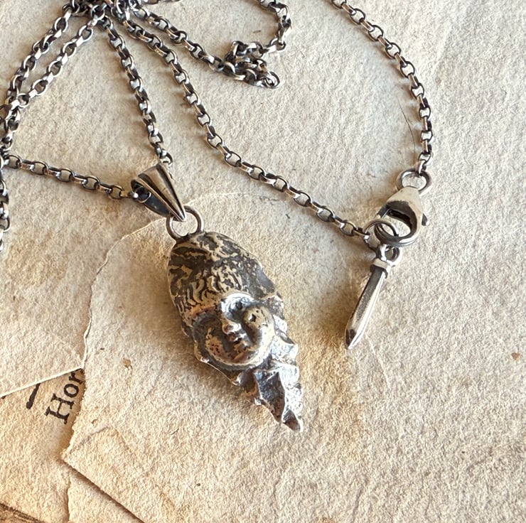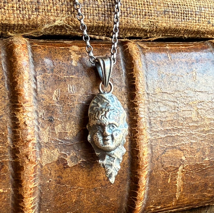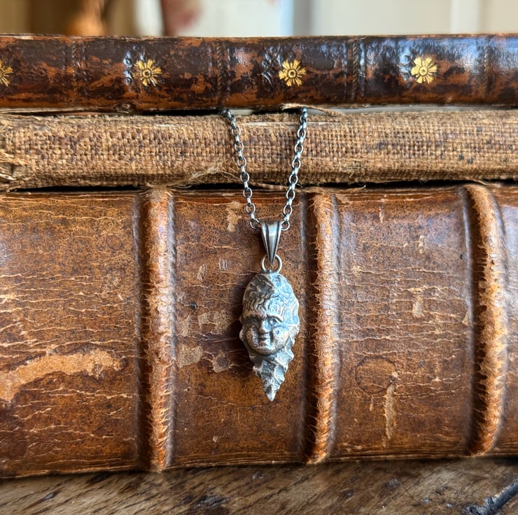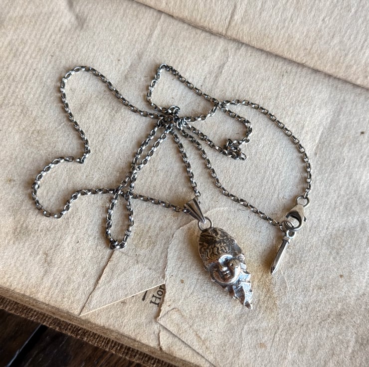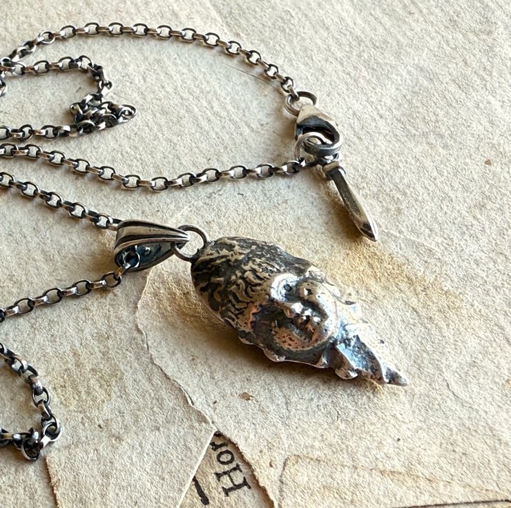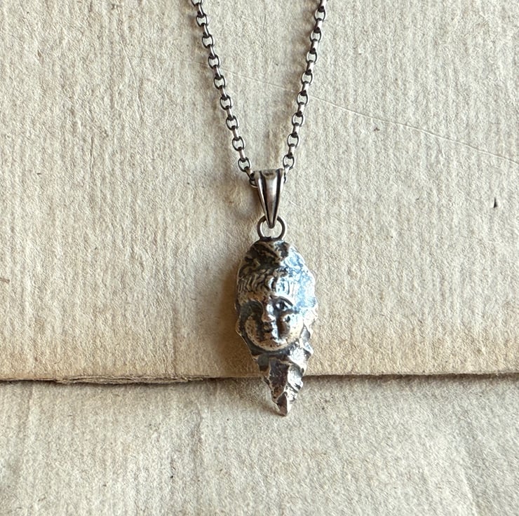 A unique Sterling silver arrow head with a cheeky dolls face! Very strange! It is cast from a genuine ancient flint arrowhead and a tiny dolls head we found during our mudlarking adventures. The pendant has been oxidised and rubbed back, enhancing the highlights for an antique vibe.