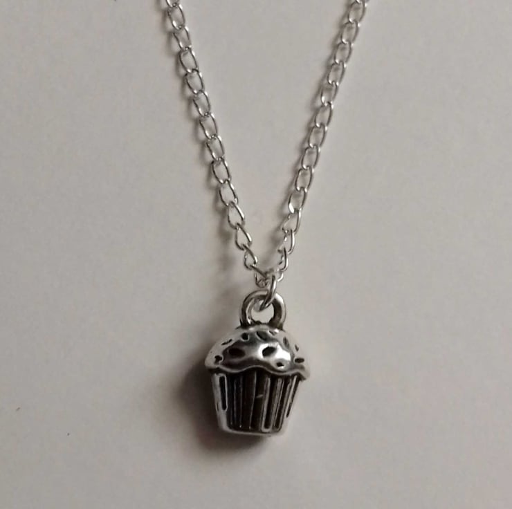 This stunning necklace has a cute cupcake charm hanging on silver plate chain.
