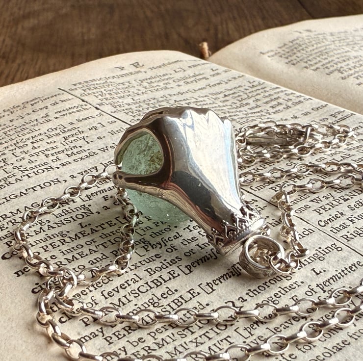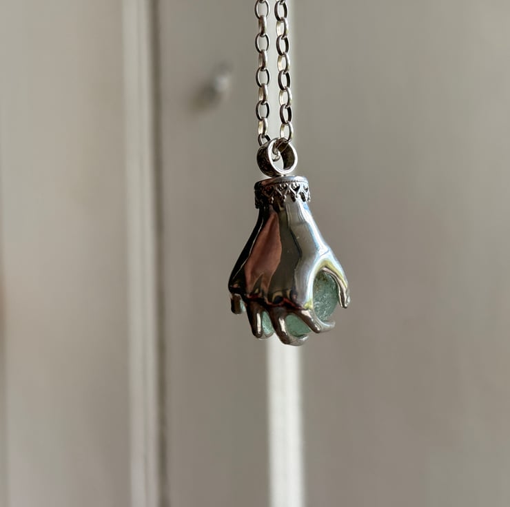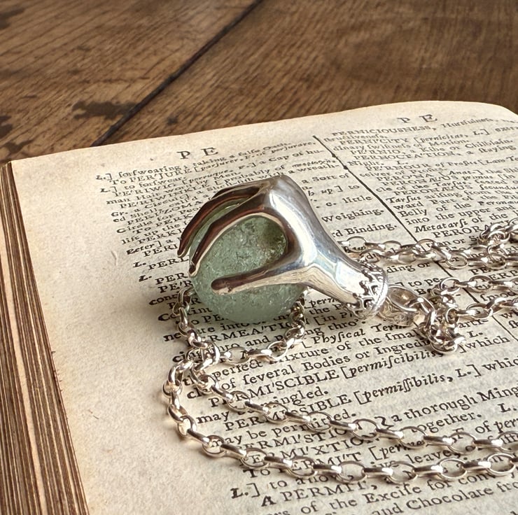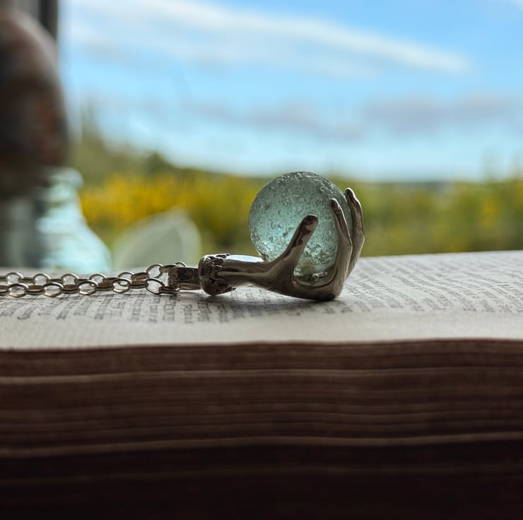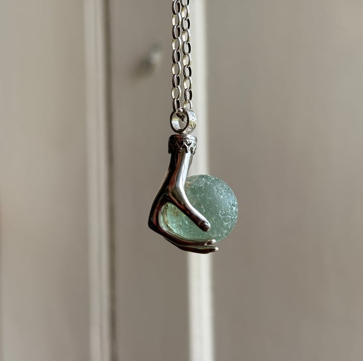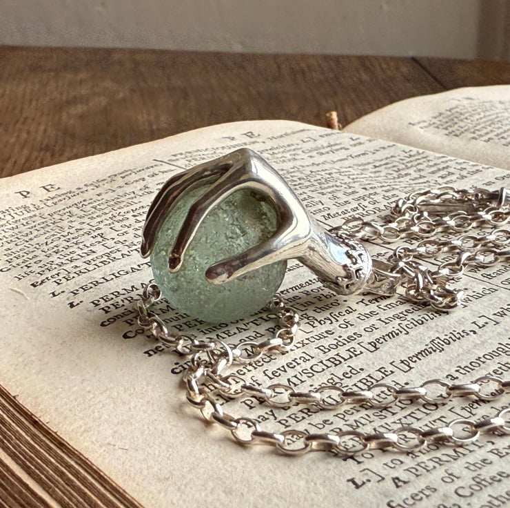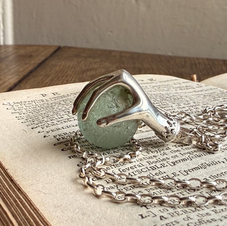 This truly one of a kind necklace is made with a Codd marble found on one of our mudlarking adventures and is Inspired by the almost 500 Codd marbles we have picked up over the years. This piece features in one of our Northern Mudlarks videos where you can watch it being made from start to finish! The hand was hand carved and cast by Alex and set holding a genuine Codd marble stopper.