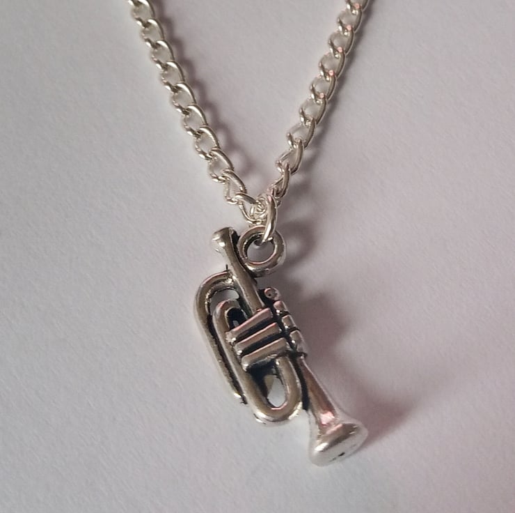 This wonderful necklace features an elegantly detailed small trumpet charm hanging on 18" silver plate chain.