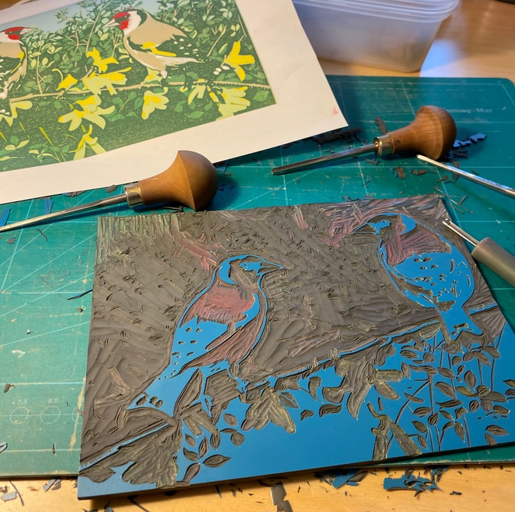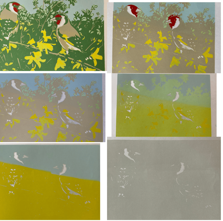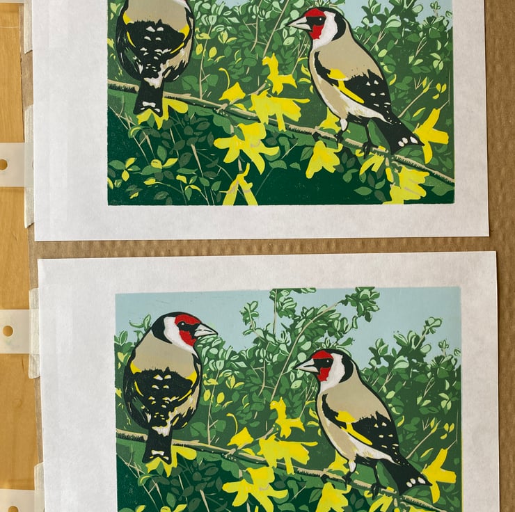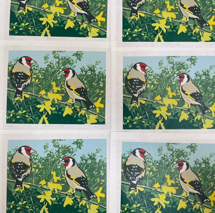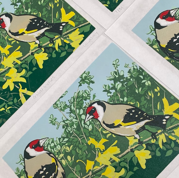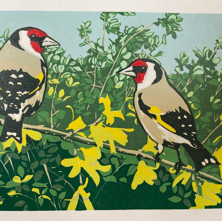 Goldfinches - Original handmade lino print in limited edition of 31. This is a completely hand made item - not a digital print. It is an 8 layer, 10 colour reduction Lino print individually hand printed on Massa printmaking paper with quality water based inks using an etching printing press. Each print is a completly hand made by me, the artist and is a unique piece of original art. Each print has been printed 8 times, once for each colour layer, over a number of weeks to gradually build the finished detailed image. As a result each print contains slight variations in tone and colour overlay making each an individual piece of art.