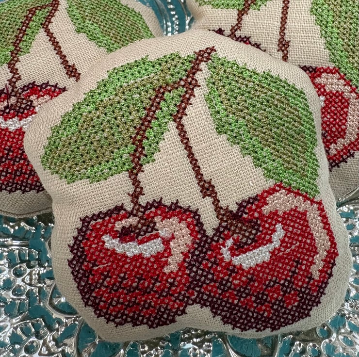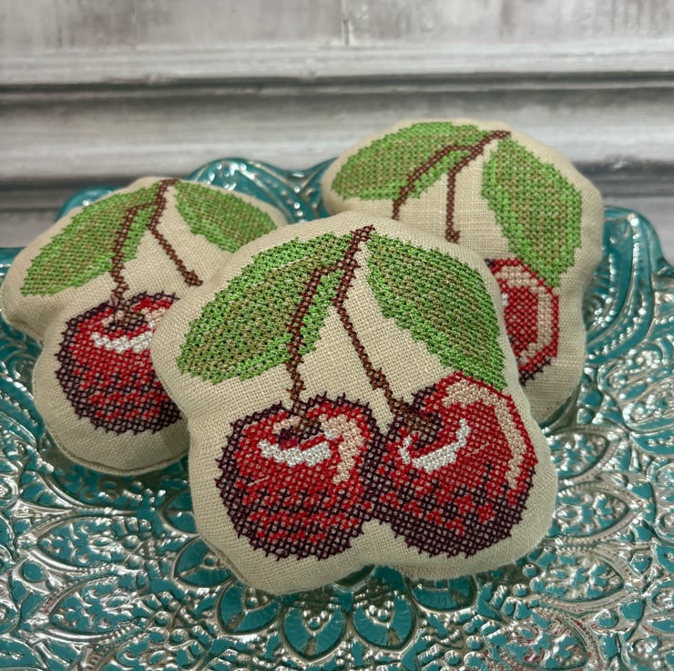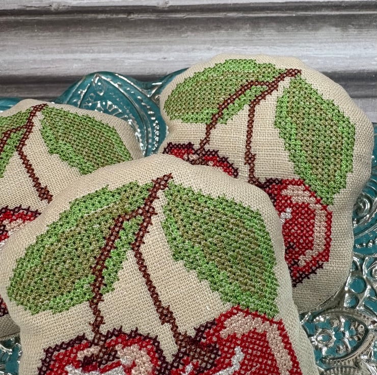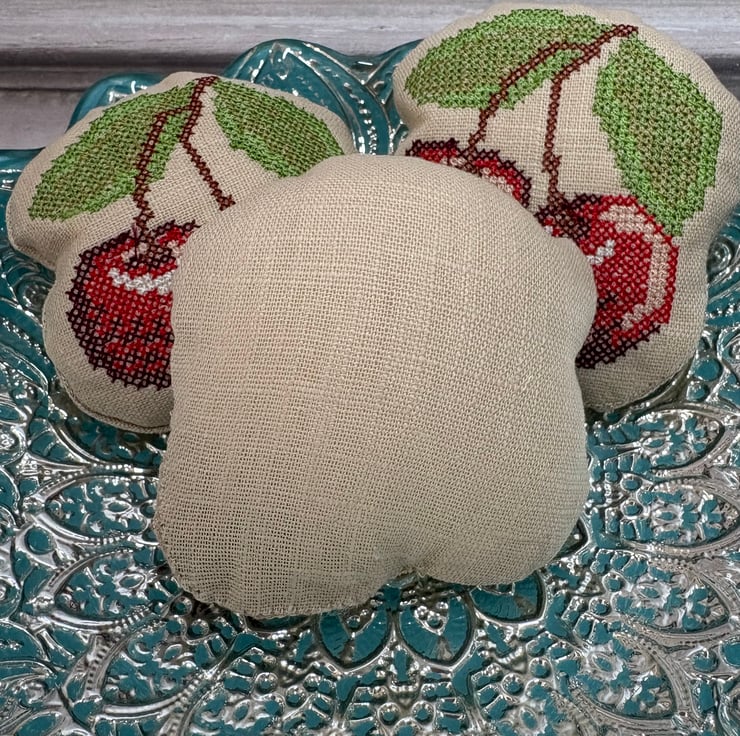 Bowl Fillers machine embroidered cross stitch design. Measuring 3.25” x 3.25”. Beige pre washed linen fabric filled with polyester fibrefill. Little pillows of fun. This design represents the season cherries. Select 1 or fill a bowl full of summer happiness.