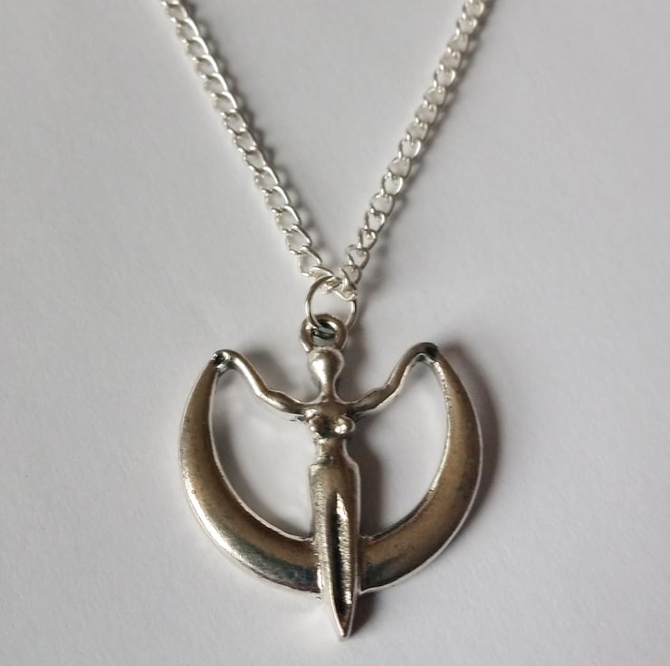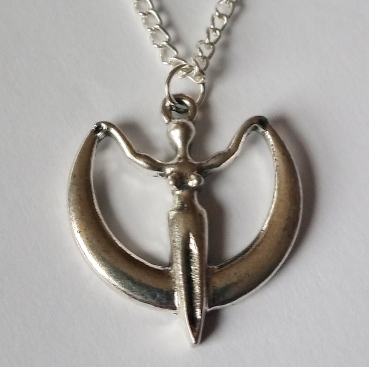 This nice necklace has a pendant with a woman holding an inverted crescent moon on 18" silver plate chain.