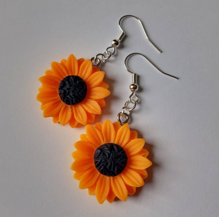 These lovely earrings feature bright sunflowers hanging from silver plate hooks.