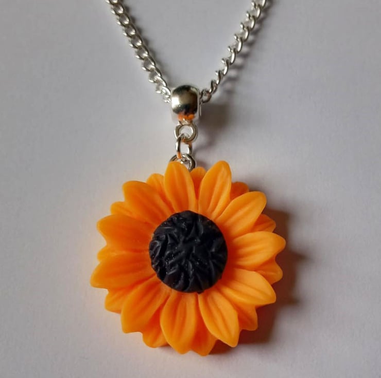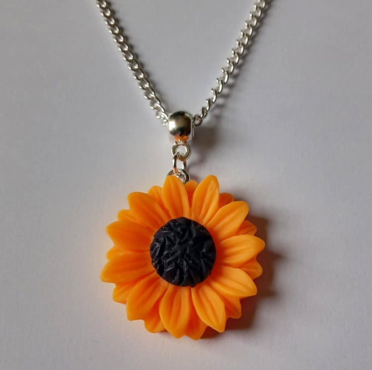 This nice necklace features a bright sunflower hanging from silver plate 18" chain.