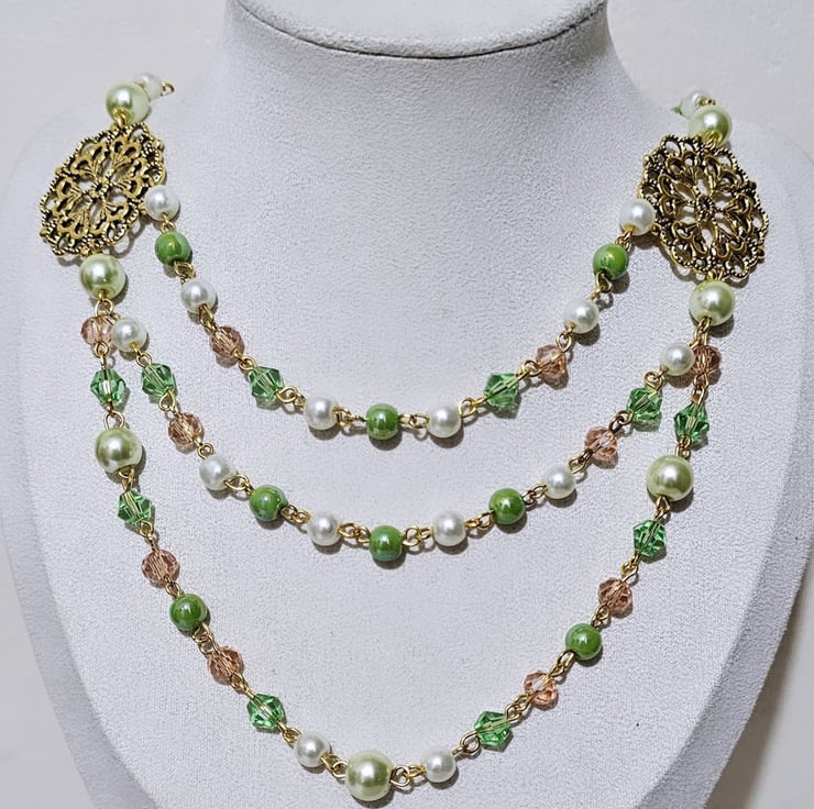 This handcrafted piece features a harmonious blend of soft green, pearl white, and pink beads, delicately linked with golden connectors. The necklace is crowned with two ornate gold filigree medallions on either side, adding a vintage, majestic touch. Perfect for weddings, festive occasions, or elegant everyday wear.