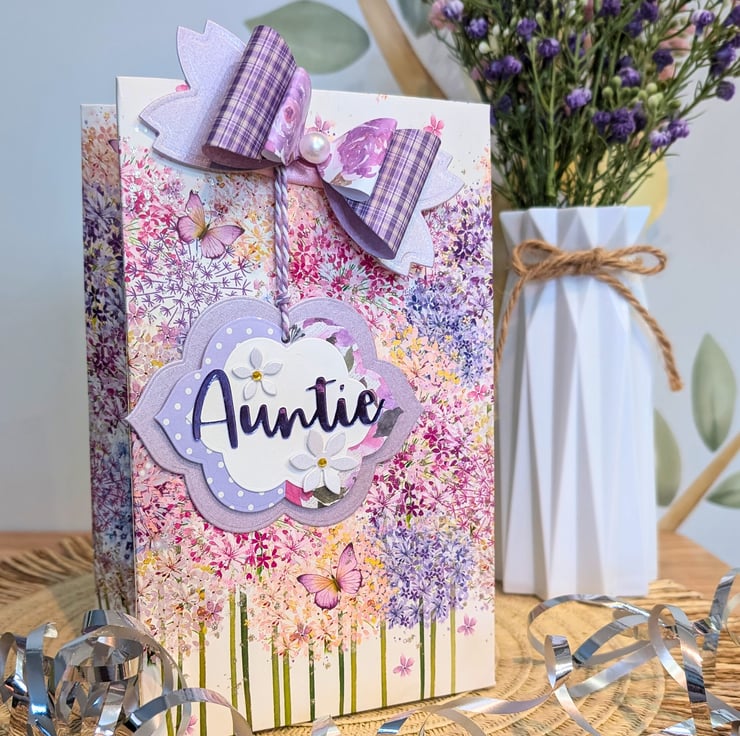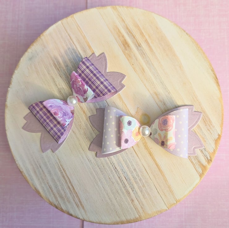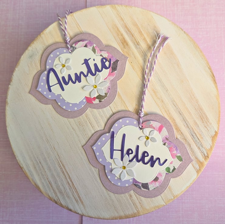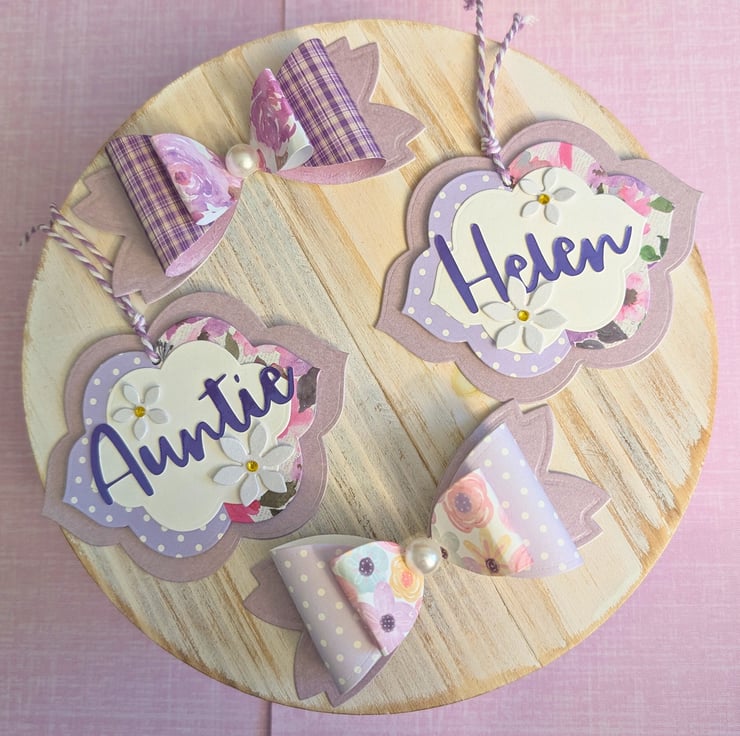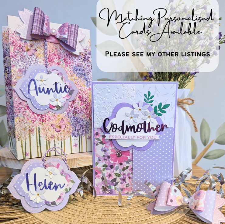 Add a special touch to your gifts with these handmade personalised gift tags, lovingly crafted with die-cut flowers and beautiful patterned paper in purple. Whether you're wrapping a birthday present, giving a thank you gift, or labeling party favours these charming tags and coordinating bows will elevate your gift-giving with style and thoughtfulness.