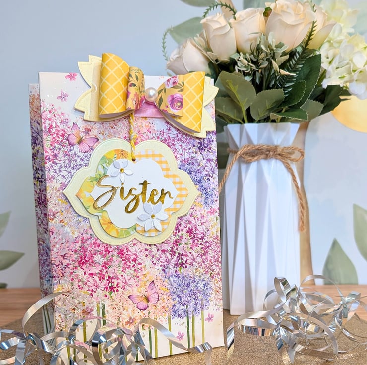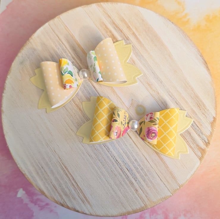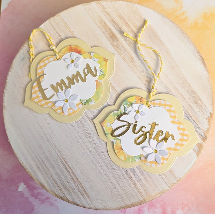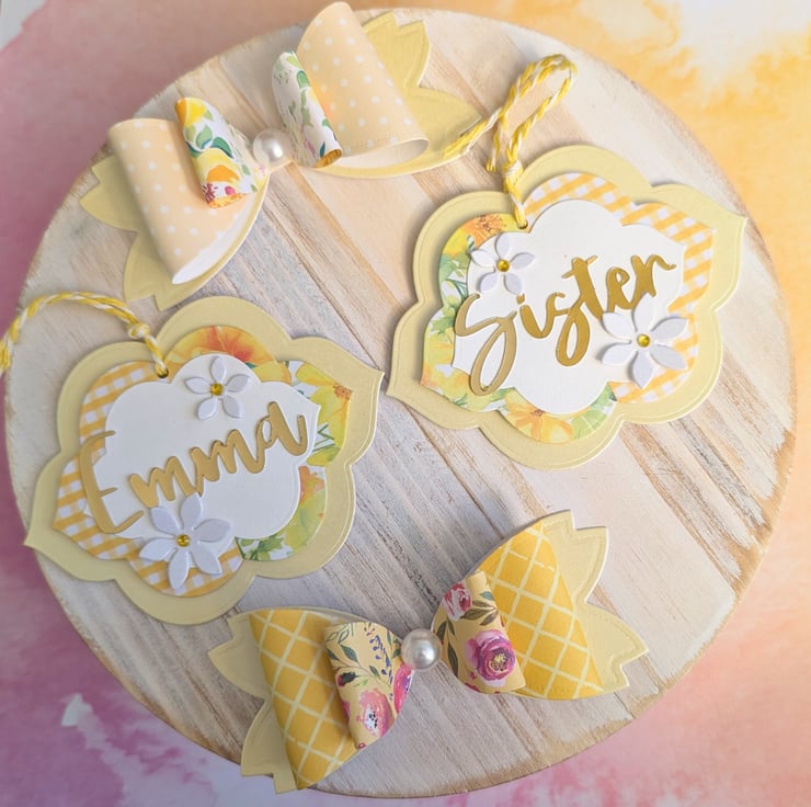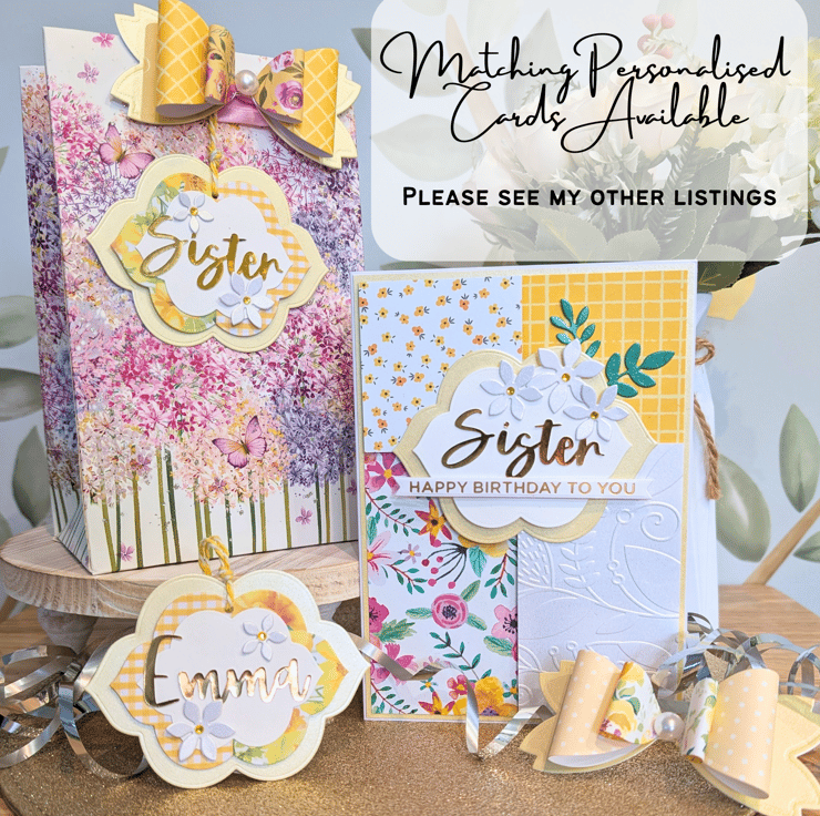 Add a special touch to your gifts with these handmade personalised gift tags, lovingly crafted with die-cut flowers and beautiful patterned paper in yellow. Whether you're wrapping a birthday present, giving a thank you gift, or labeling party favours these charming tags and coordinating bows will elevate your gift-giving with style and thoughtfulness.