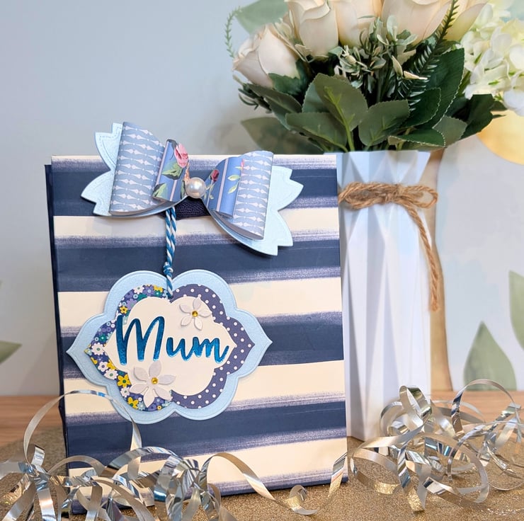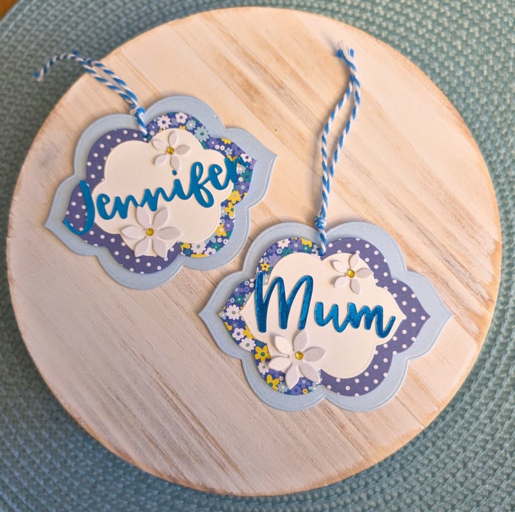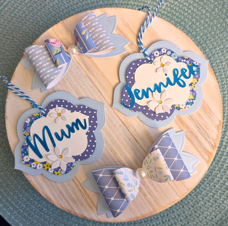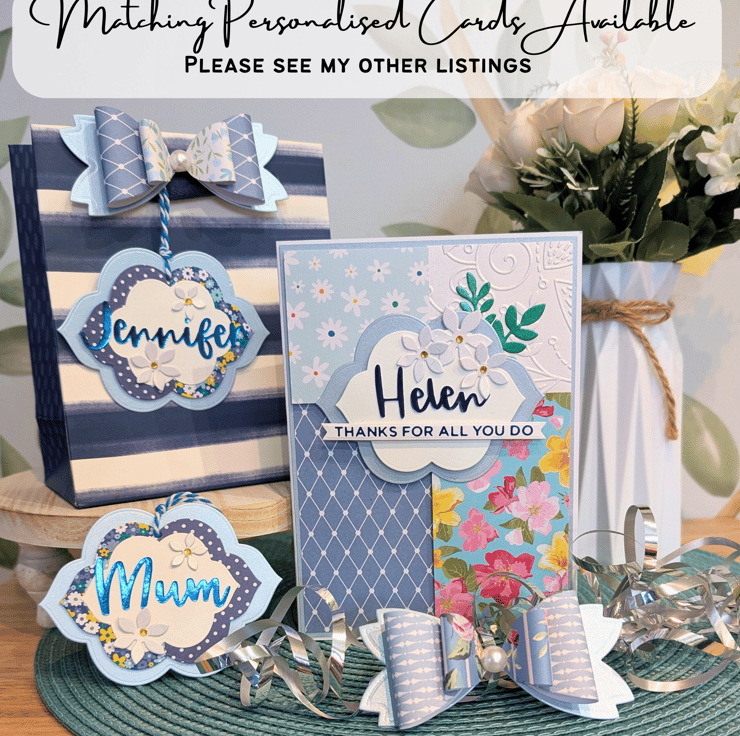 Add a special touch to your gifts with these handmade personalised gift tags, lovingly crafted with die-cut flowers and beautiful patterned paper in blue. Whether you're wrapping a birthday present, giving a thank you gift, or labeling party favours these charming tags and coordinating bows will elevate your gift-giving with style and thoughtfulness.