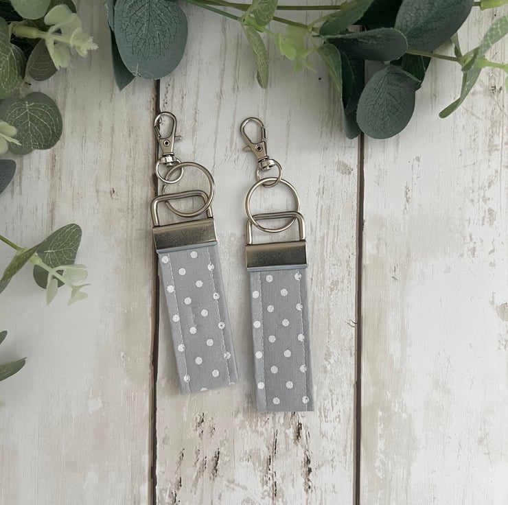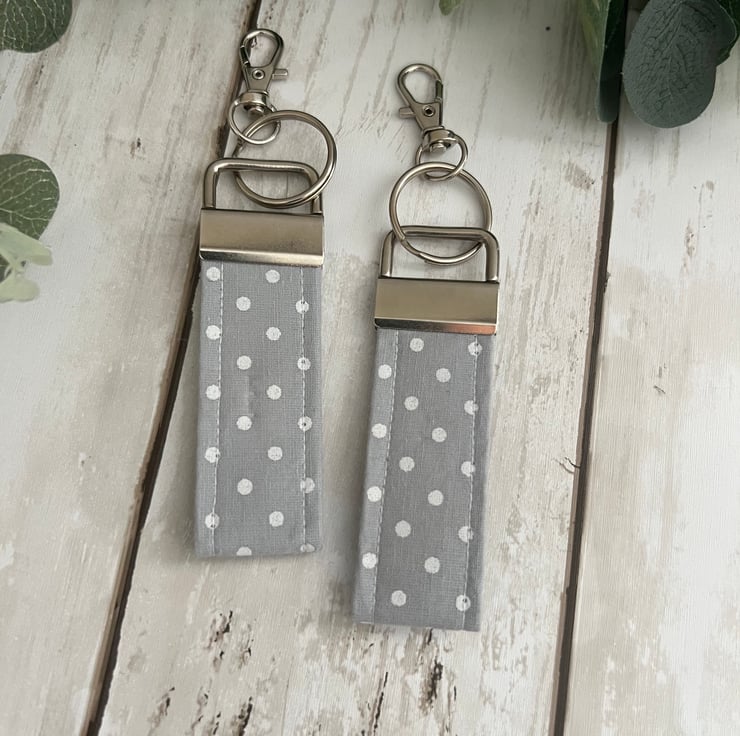 Handmade fabric key fob set, key ring, bag strap in a grey & white polka dot design.