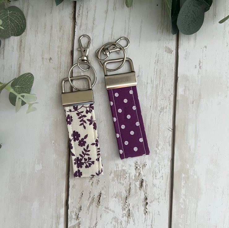 Handmade fabric key fob set, key ring, bag strap in a purple & cream polka dot & floral design.