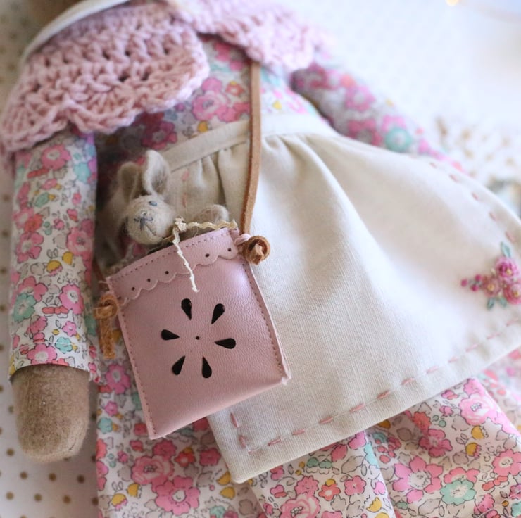 Her accessories include a tiny leather bag, hand punched with a daisy design and containing a baby bunny with a ric rac tie.