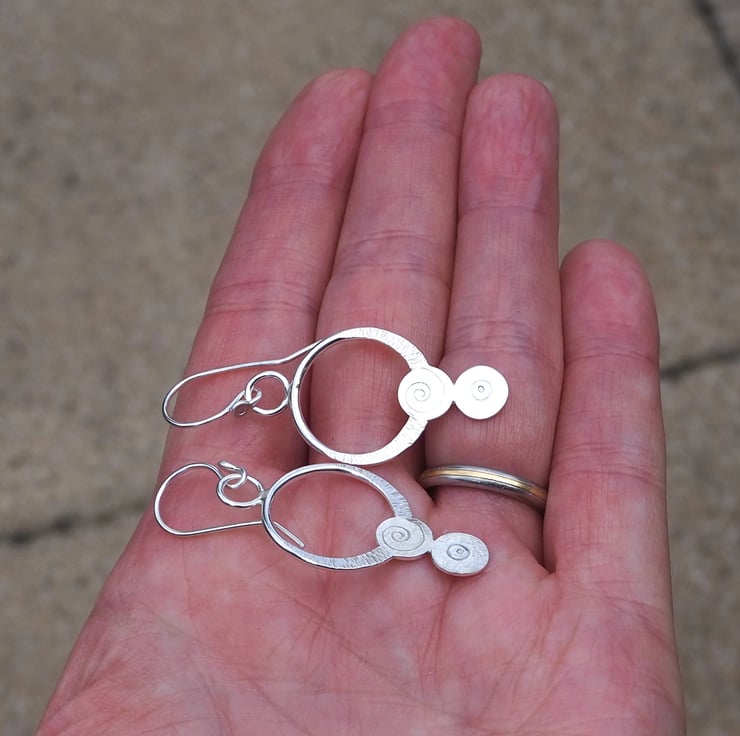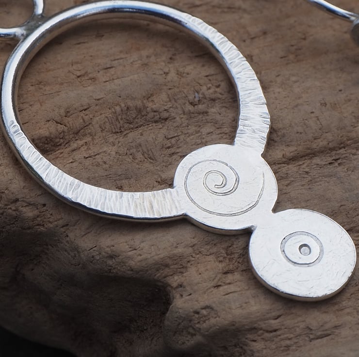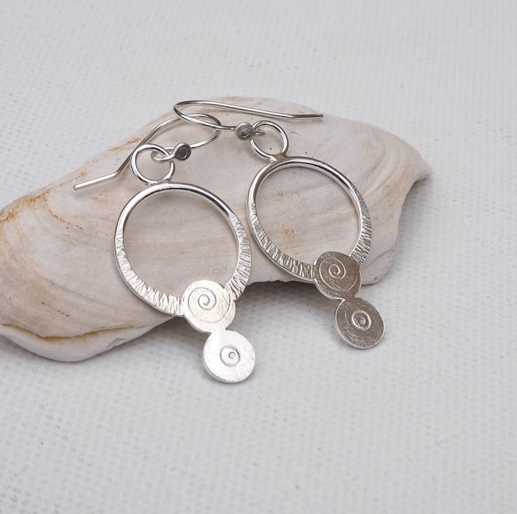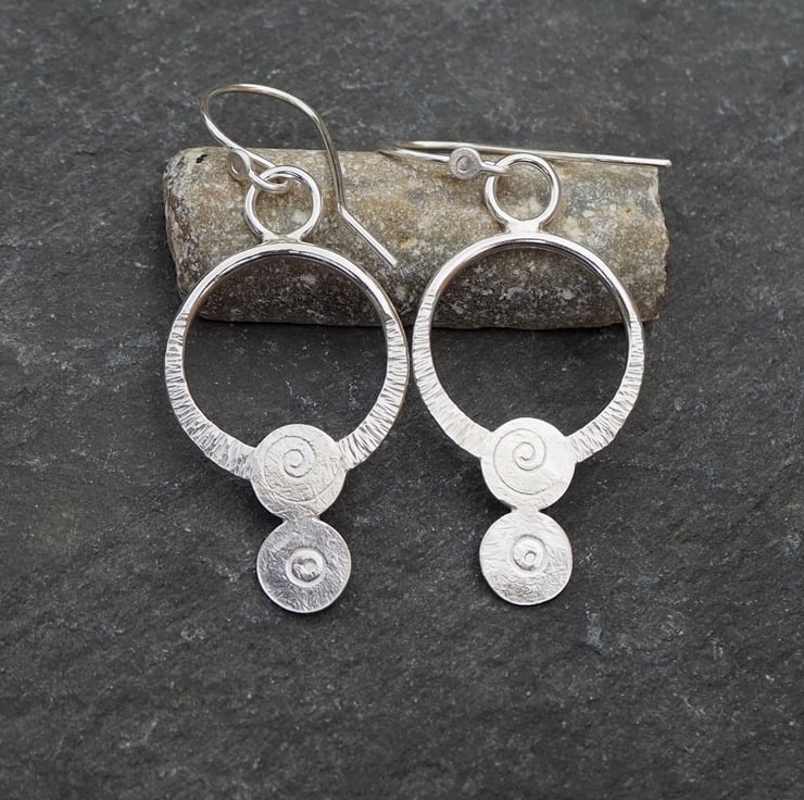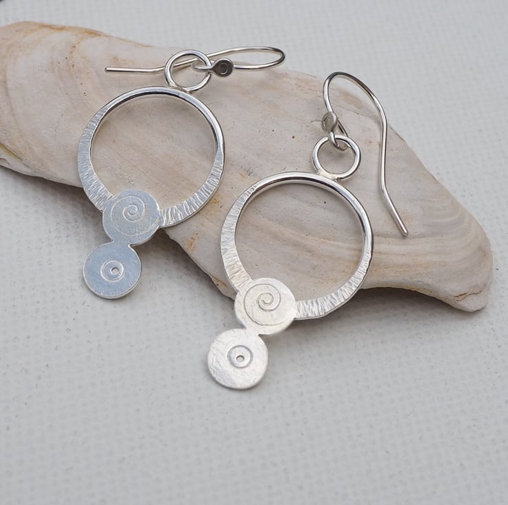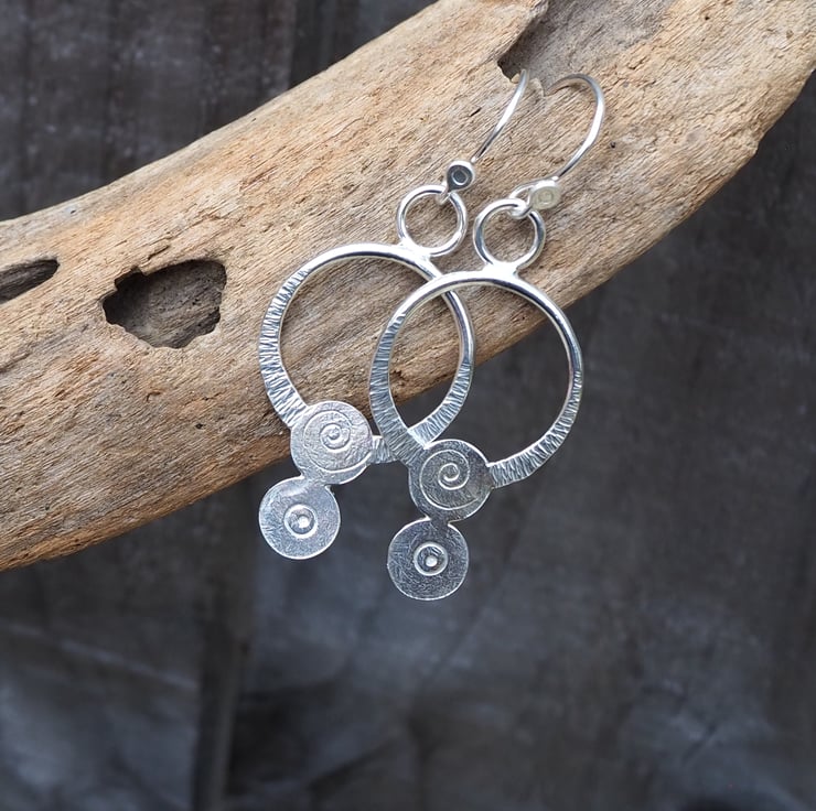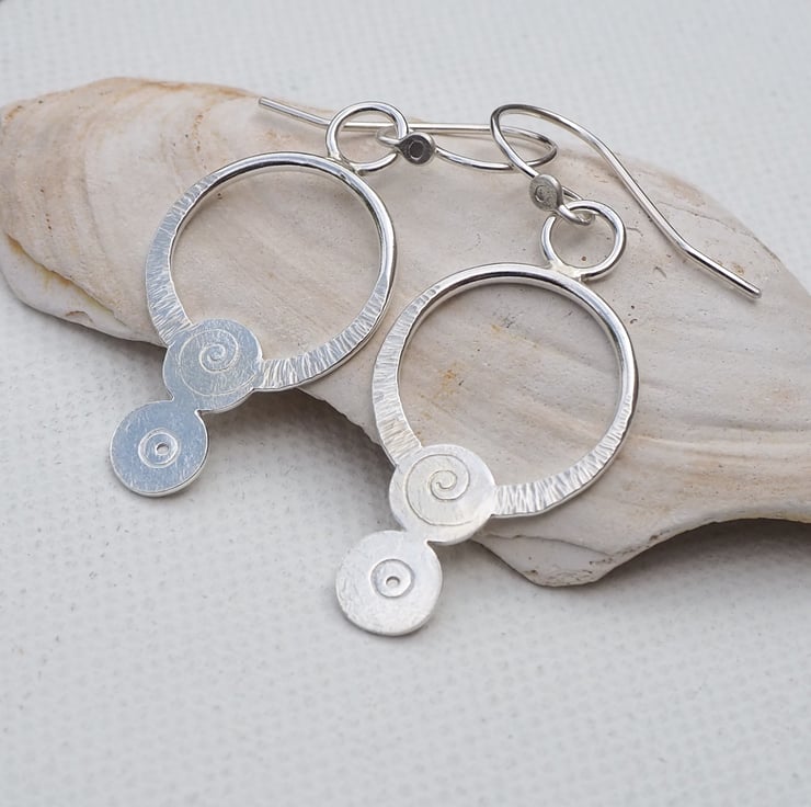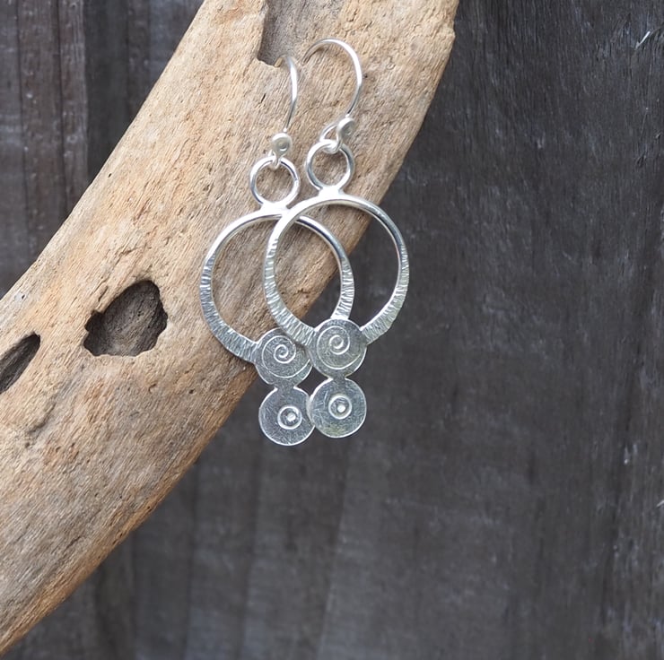Handmade silver tribal hoop earrings with spiral and hammered texture detail.