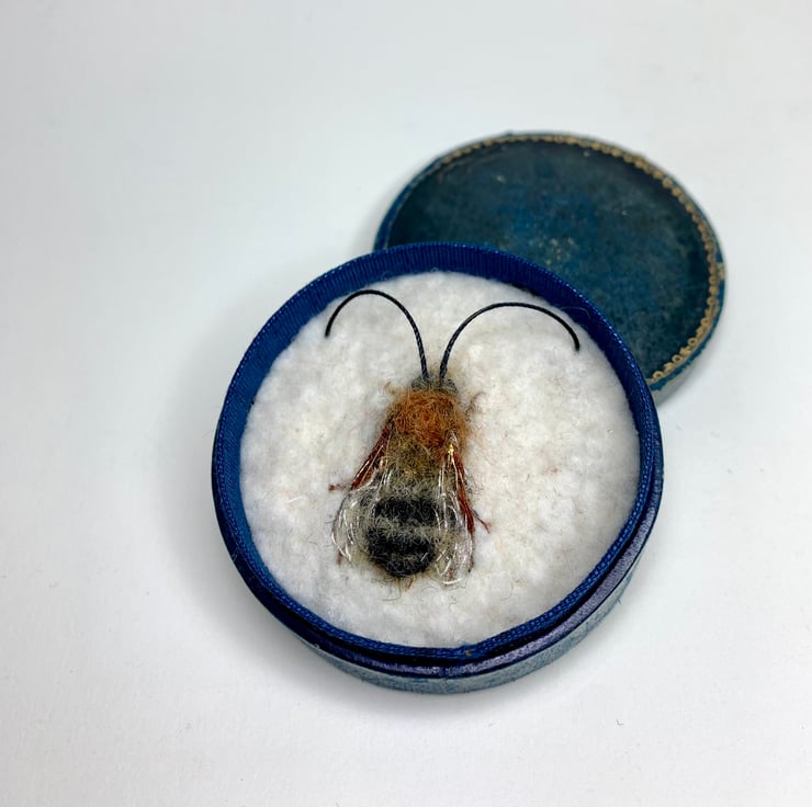 He is built into a beautiful antique blue tooled leather container. The later pictures show the scale of this bee compared to the others in the collection.