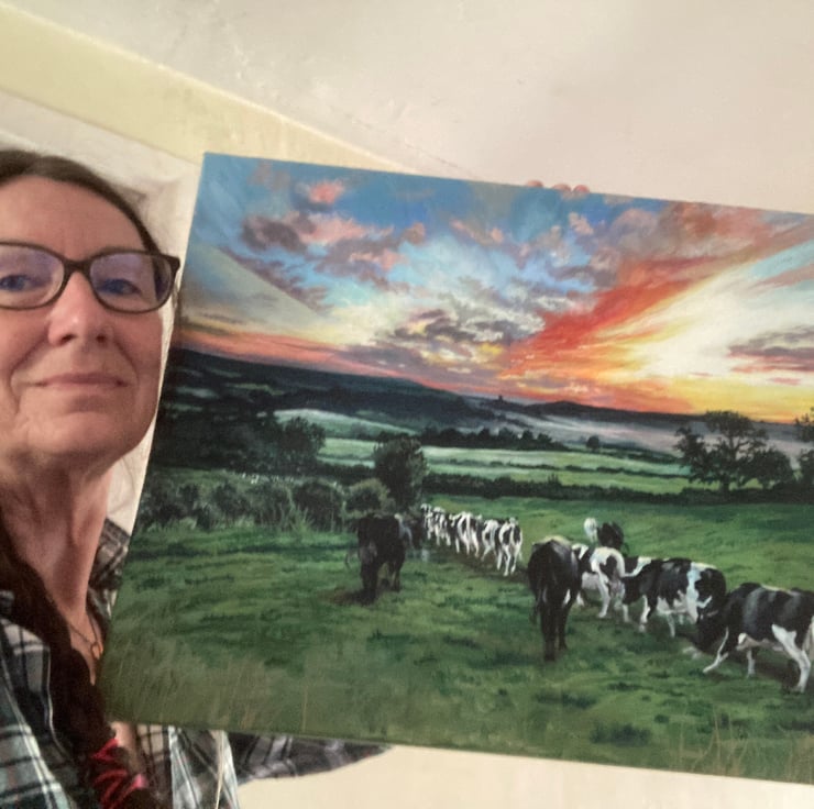 The original painting is based on one of the views I see nearly every day as I walk the fields where I live. The early morning sky is so beautiful, I could look at it all day, if it stayed that long!