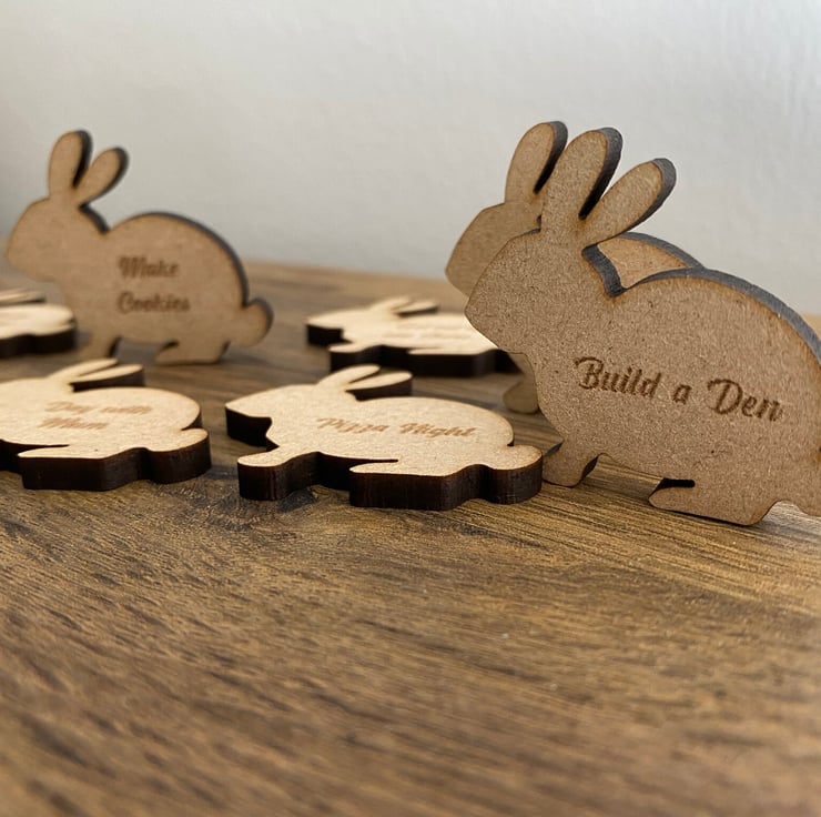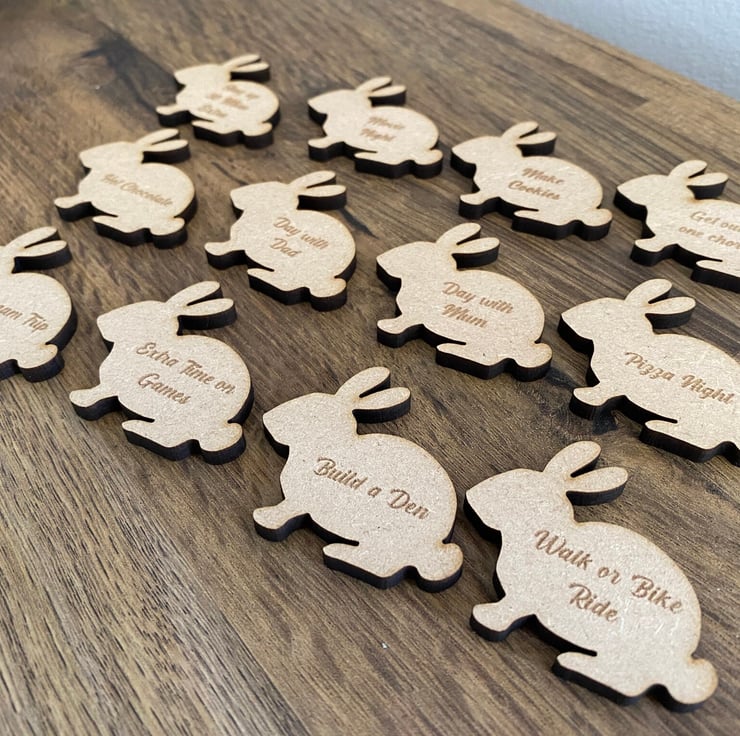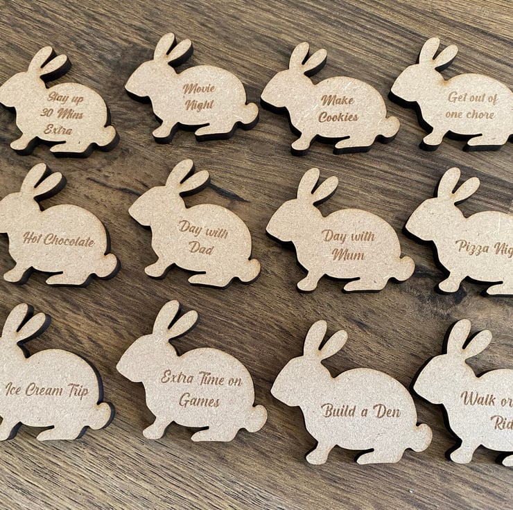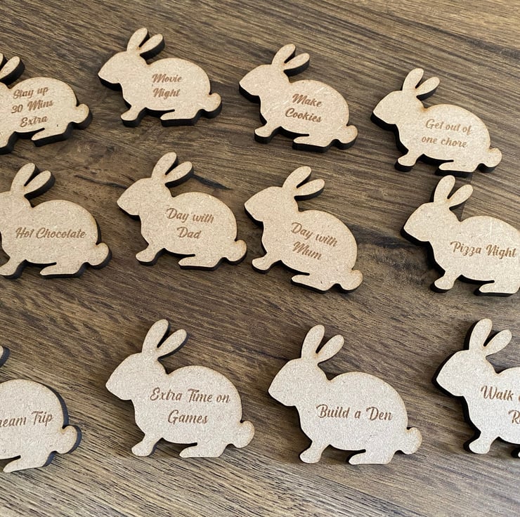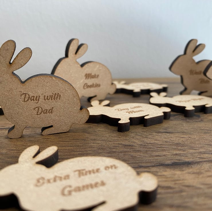 Add a unique touch to your Easter celebrations with our handmade Easter Tokens. These wooden tokens are an alternative to traditional chocolate eggs and are perfect for an Easter egg hunt. Each token is shaped like a bunny with a reward engraved on it. You can customize each token with any text you would like before checkout, making it unique to your family and children. Made from MDF or Maple, these tokens are cut and engraved in-house using a laser machine and only the highest quality natural materials. There are natural variations of wood grain and color, making each token unique. Measuring approximately 45mm in width and 45mm in height, these tokens are perfect for collecting in exchange for money, screen time, movie night, or a new toy.