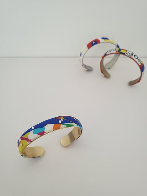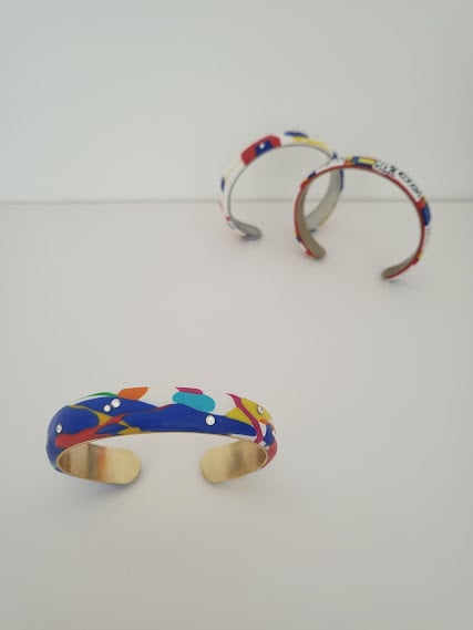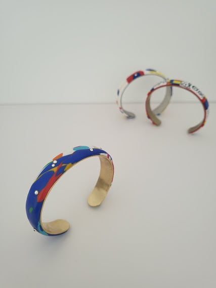 The 'Colour Burst Bangle' is a tribute to the vibrant spirit of modern abstract art. Inspired by the bold, uninhibited brushstrokes of Abstract Expressionism and the joyous, non-representational palettes of Fauvism, this piece captures the essence of artistic freedom. Each vivid splash of colour, accented by subtle shimmer, transforms the bangle into a wearable canvas, designed to evoke a sense of playfulness, spontaneity, and the sheer delight of pure form and hue.
