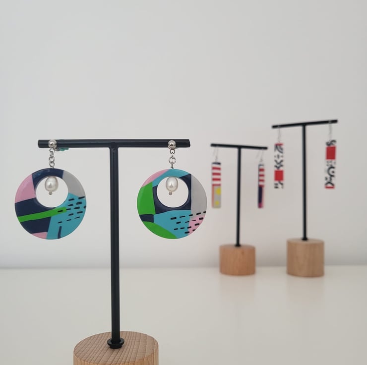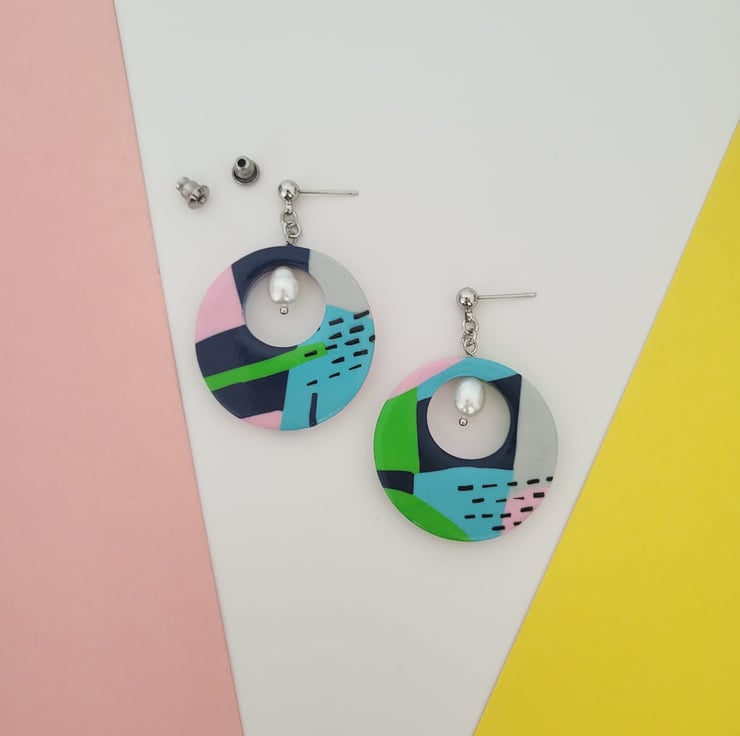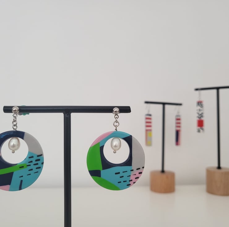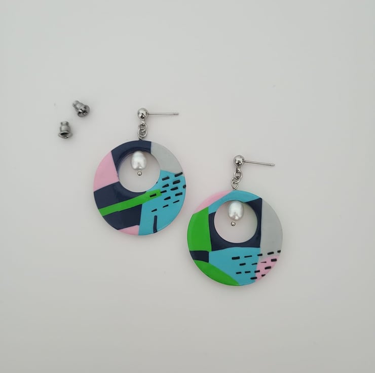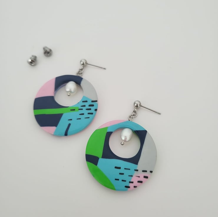 These captivating statement earrings blend contemporary design with a playful artistic flair. Each earring features a circular, open-centre design adorned with a dynamic abstract pattern. One earring showcases cool tones with shades of teal, navy, grey, and hints of pink, while its counterpart leans into warmer greens, blues, and grey with a touch of darker pink. Both are embellished with subtle dash-like patterns and feature a single, lustrous pearl suspended elegantly within the open circle, adding a touch of classic sophistication. Crafted with stainless steel posts, these lightweight earrings are designed for comfortable wear, making them a vibrant and unique accessory perfect for adding an artistic touch to any ensemble.