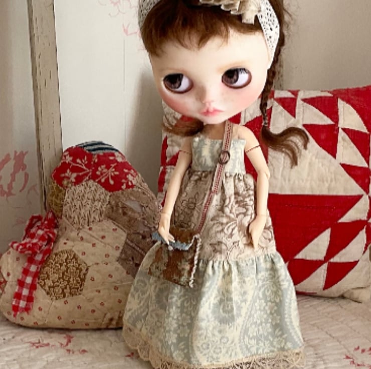 - a long tiered maxi dress made from two French General fabrics, by Moda. The shoulder straps are made from a sari silk ribbon with raw edges. Trimmed antique lace on the hemline. Fastens with a popper at the back.