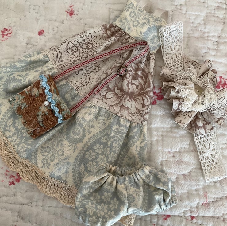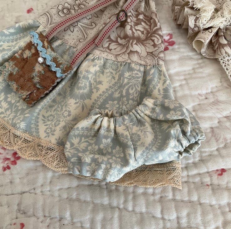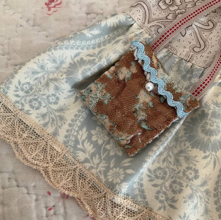 - a cross body bag, made from a piece of antique quilt. It fastens with a bead and button thread loop. The flap is trimmed with narrow ricrac. The cross body strap is created from a primitive style ribbon, and has a buckle fastening, which is functional.