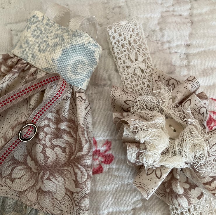 - an antique lace hairband which fastens with Velcro at the back. Decorated with a gathered strip of Moda fabric, which is trimmed with a small piece of scrim and a pearl button.