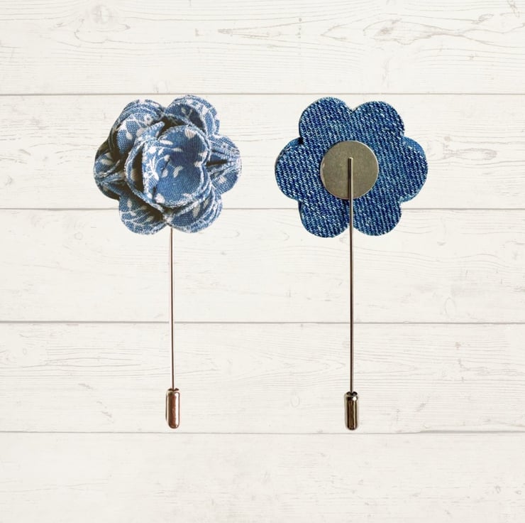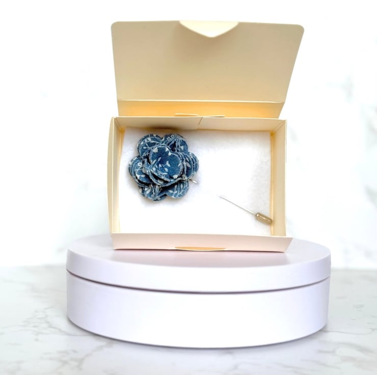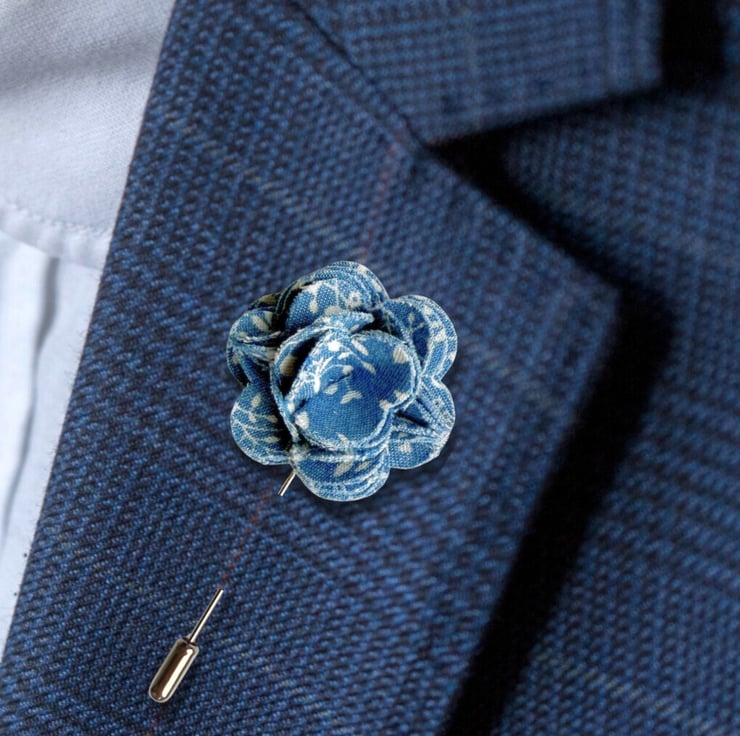 Add a stylish finishing touch to your outfit with this handcrafted fabric flower lapel pin. Carefully sewn by hand using denim blue floral-print fabric; a perfect finishing touch for weddings, parties or simply elevating your everyday suit.