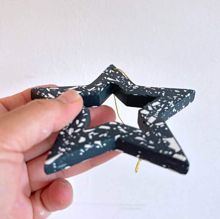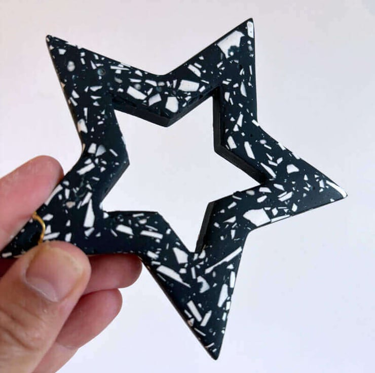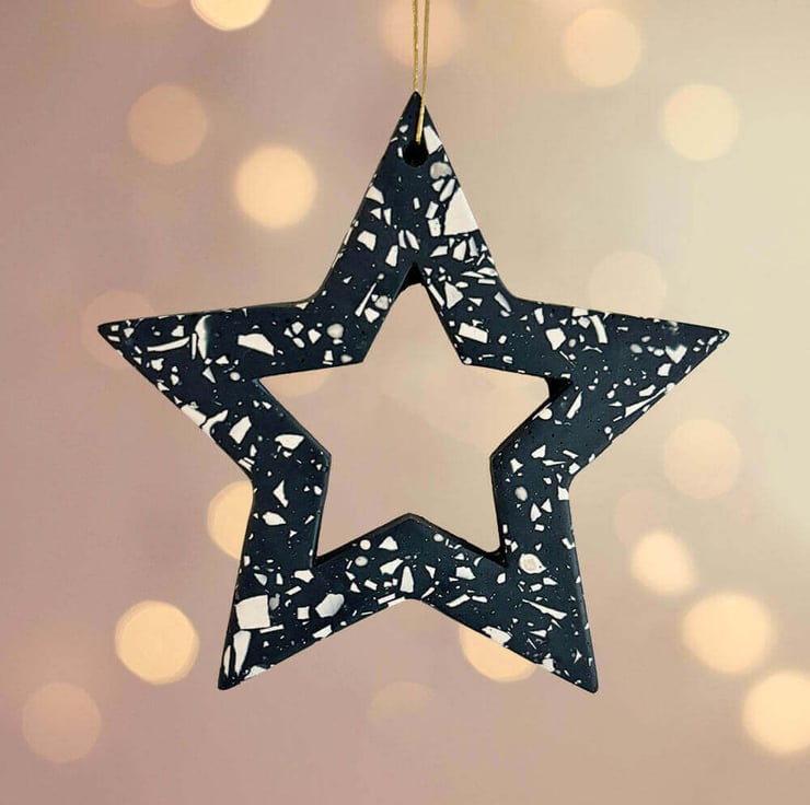 Elevate your holiday decor with our handcrafted navy terrazzo large star Christmas ornament. Searching for a unique, eye-catching sustainable Christmas tree decoration? Our handmade rainbow terrazzo star ornament is the perfect addition to your holiday festive decor