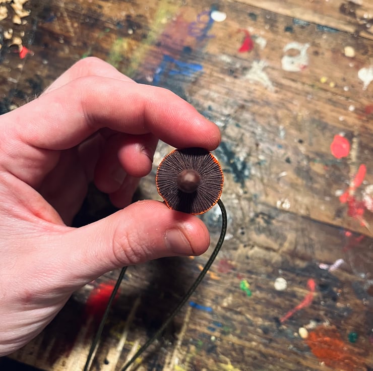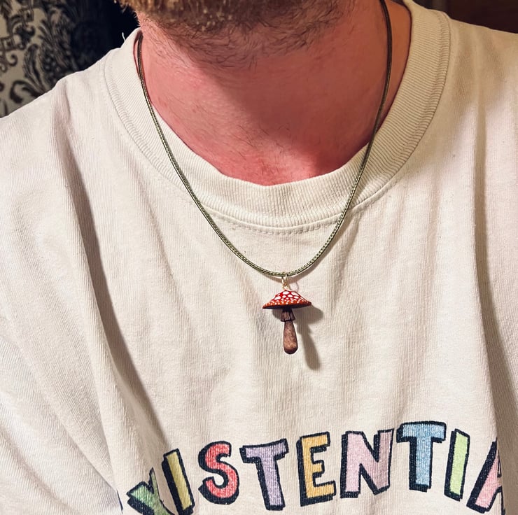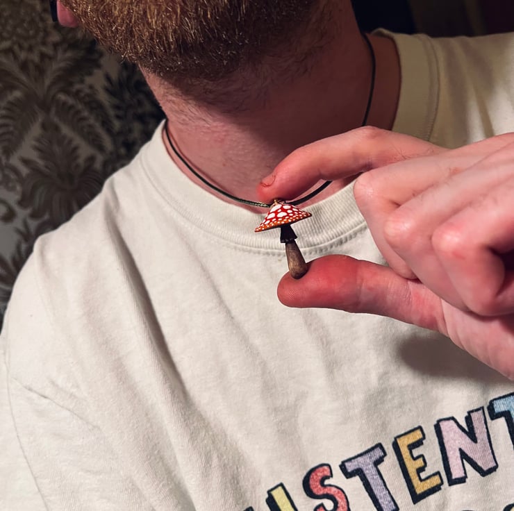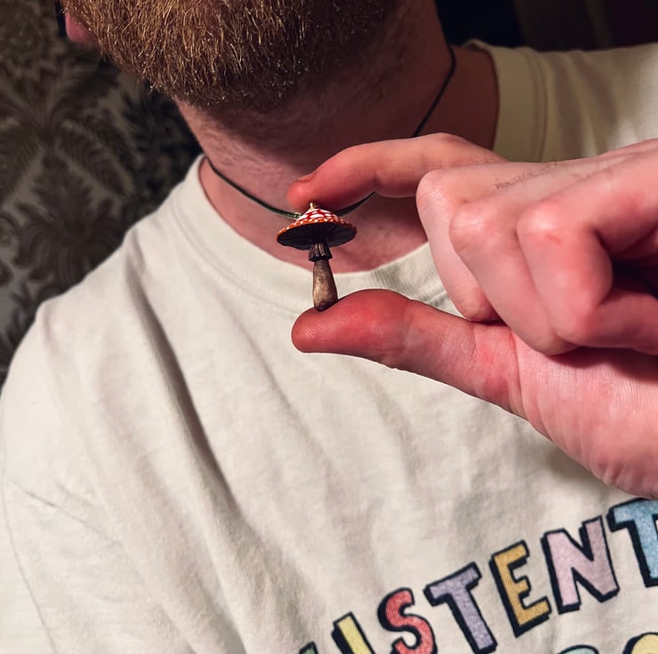 A fly agaric mushroom pendant, hand carved from alder wood and finished with a blend of natural oils and wax polish. The cap has been painted with acrylic. This shroom is a bit smaller than my other mushrooms, measuring a wee 1 inch tall. It hangs from a lichen green wax cord necklace with gold clasps - different necklace cord colours available, so let know if you’d like to switch it up! Other colours are: Black, White, Pale Blue, Dark Brown, Medium Brown.