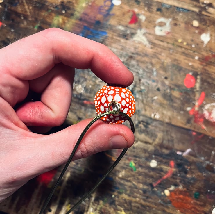 A red fly agaric mushroom pendant on a wax cord necklace.