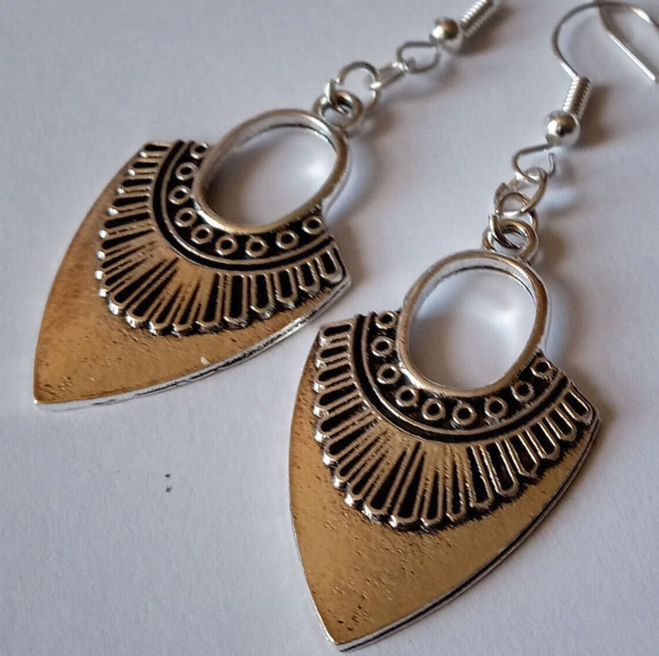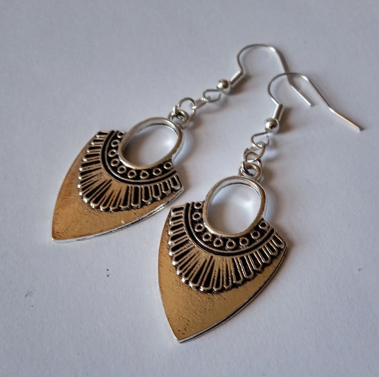 These gorgeous earrings feature elegantly detailed arrowheads hanging from silver plate hooks.