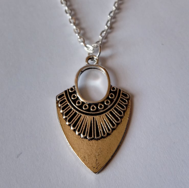 this stunning necklace has a large beautifully detailed arrowhead pendant hanging on 18" silver plate chain.