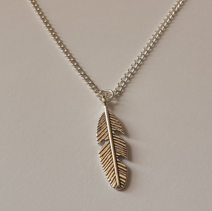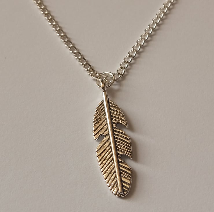 Beautiful feather pendant hanging on 18" silver plate chain.